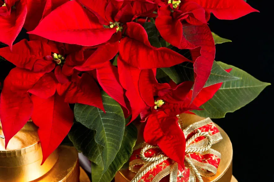 A: The red part of a poinsettia is actually the leaves and the flower is the yellow centre of the stem that looks almost like little berries. When those open up, that’s when your plant is actually blooming.