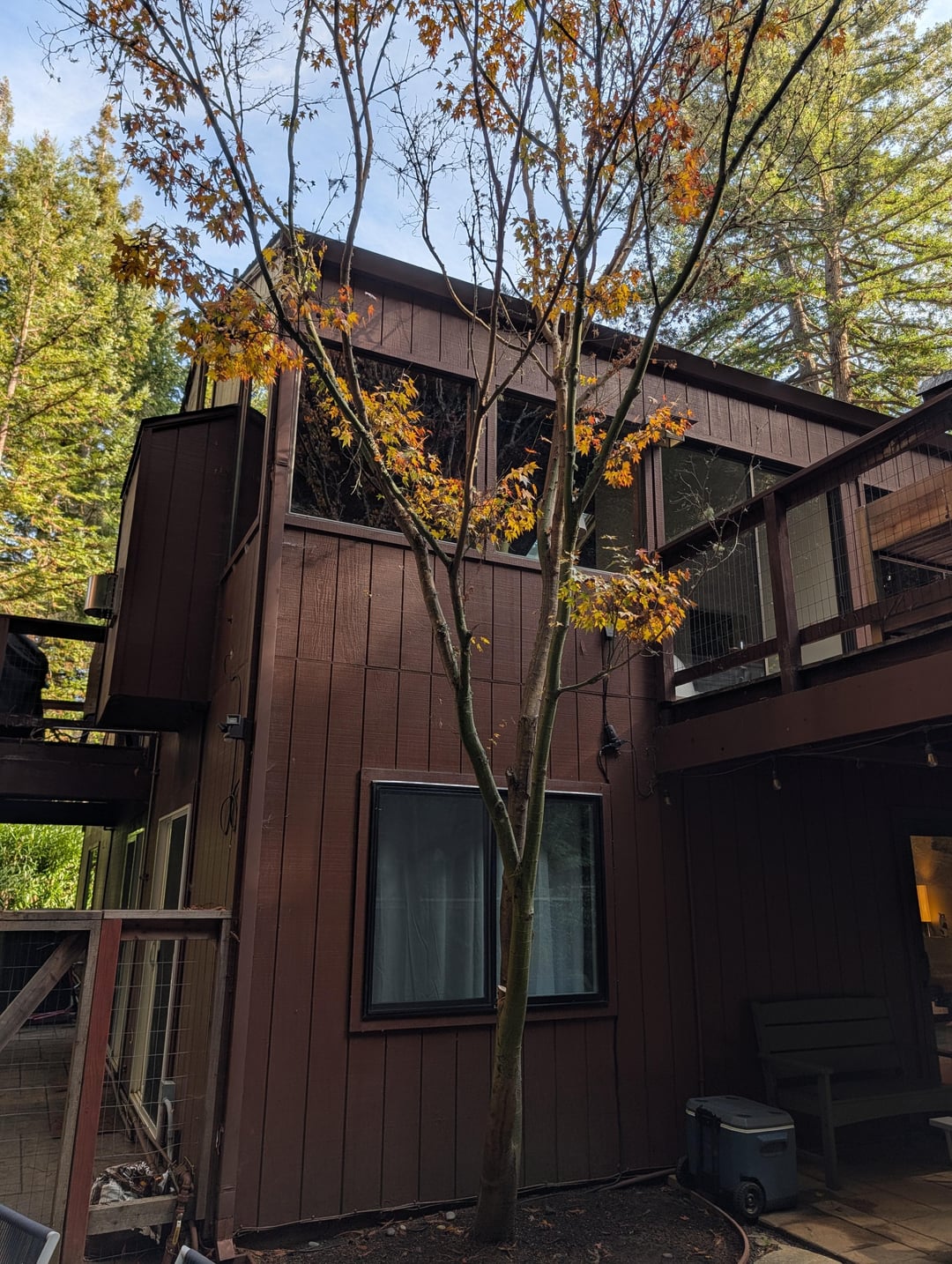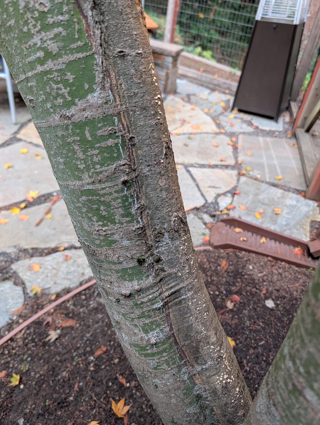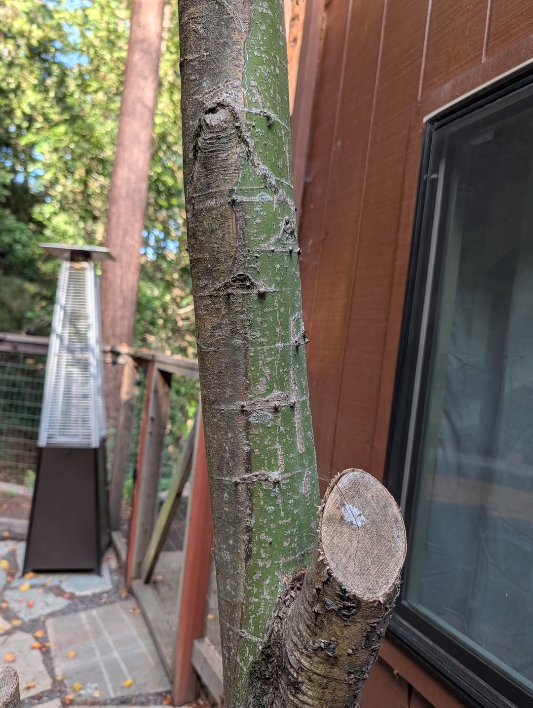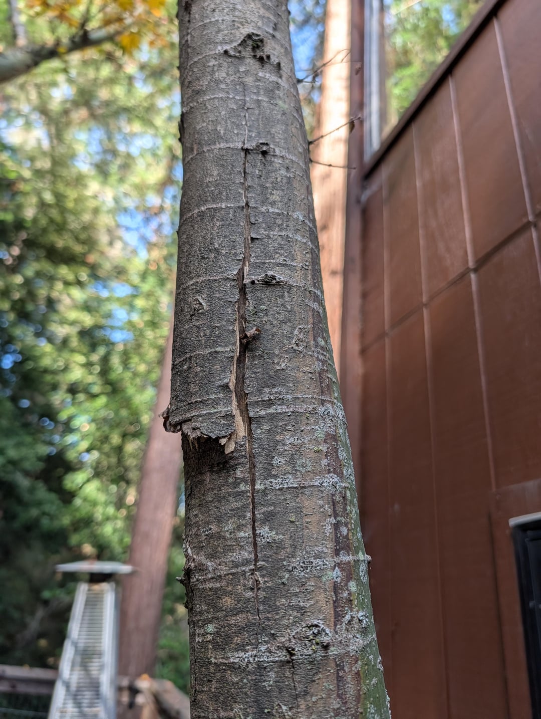 I need to trim this tree to be at least 5 feet from the roof for insurance. I noticed that it doesn't look very healthy though. It has peeling bark and is starting to grow mushrooms. Is this tree going to totally die? If not, any tips for trimming it in a way that won't kill it? I can't wait for the optimal season since I need insurance coverage now.