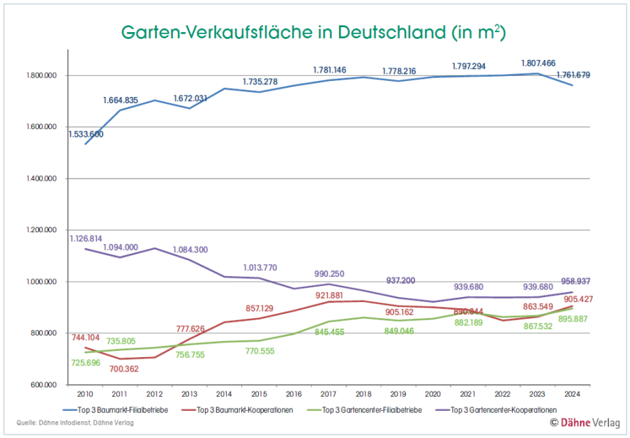 In 2024, the German gardening market saw a two-pronged development. While the sales area of the top 20 garden market operators increased by 1.0 percent overall, the garden sales area of the top 3 hardware store chain operators (Obi, Toom/B1/Klee, Bauhaus) declined by around 2.5 percent. At the same time, the sales area of the top three DIY store cooperatives (Hagebau, Bauvista, Eurobaustoff) increased by 4.8 percent, that of the top three garden center chain operators (Dehner, Blumen Risse, Pflanzen-Kölle) by 3.3 percent, and that of the top three garden center cooperatives (Sagaflor, Ekaflor, Egesa-Zookauf) increased by 2.0 percent.
