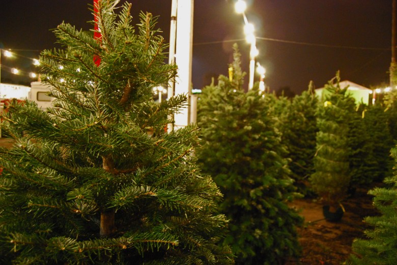 Christmas trees at a tree lot at night. Courtesy Getty Images.