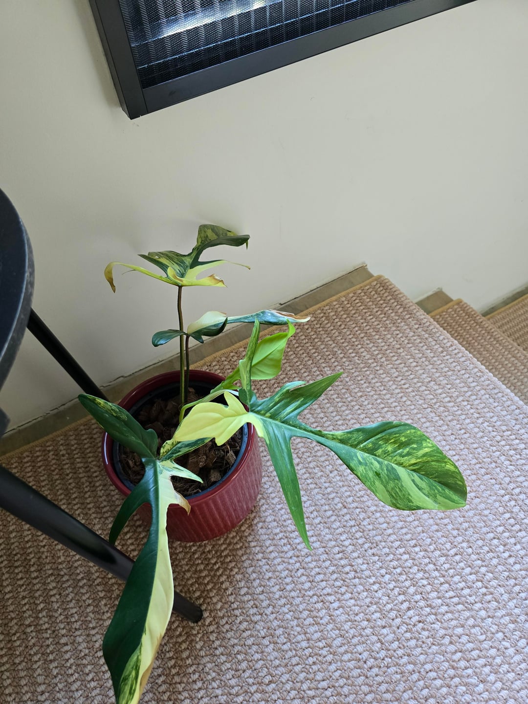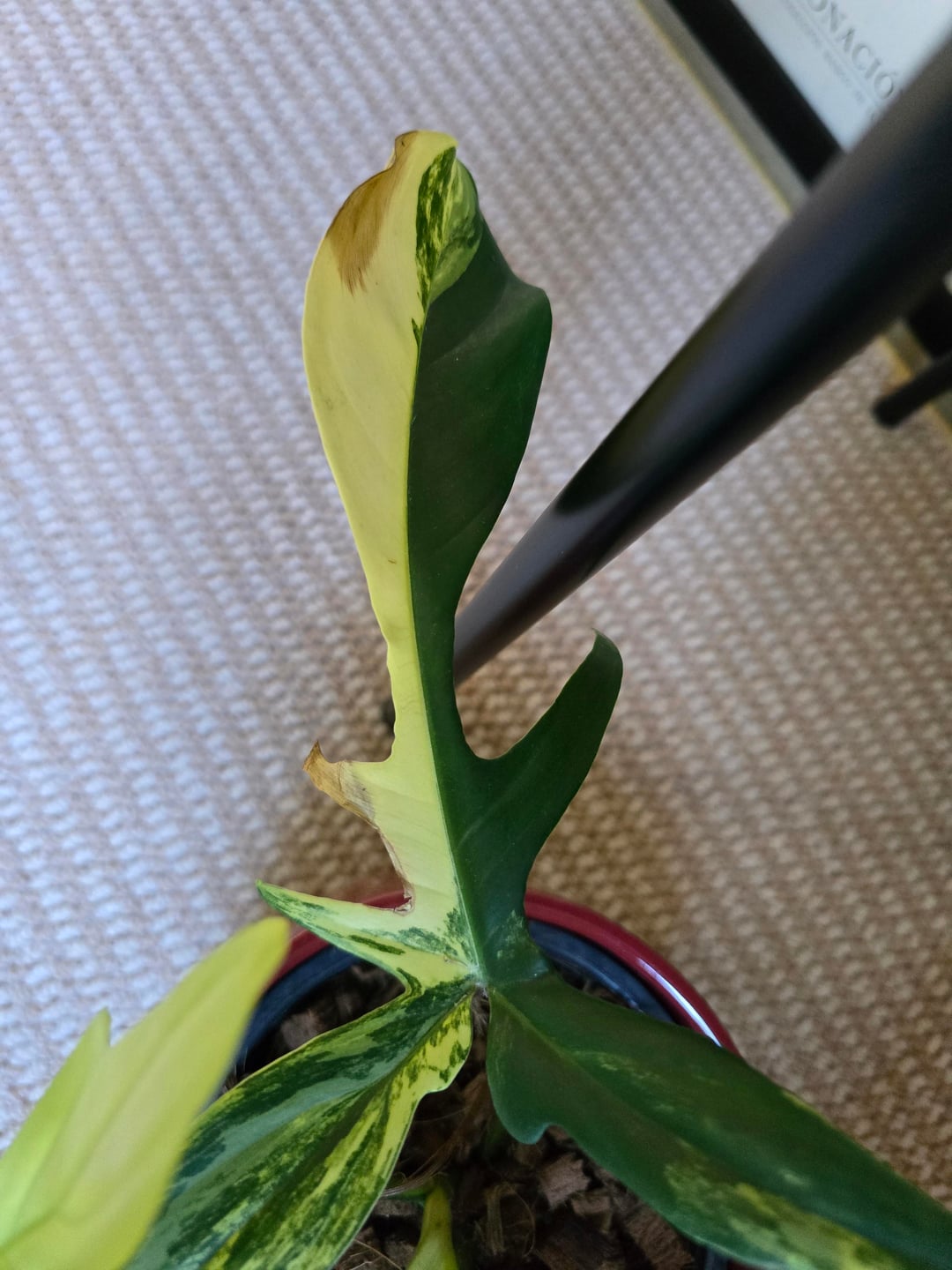 Hello and help. I bought this philodendron recently at the plant market and I placed it by my window. It receives indirect light (not glaring bright light) and I only watered it once when the top soil was dry. Why are there browns pots on the light green half of the leaves, but not the darker green? What am I doing wrong? Insights appreciated. Thank you.
