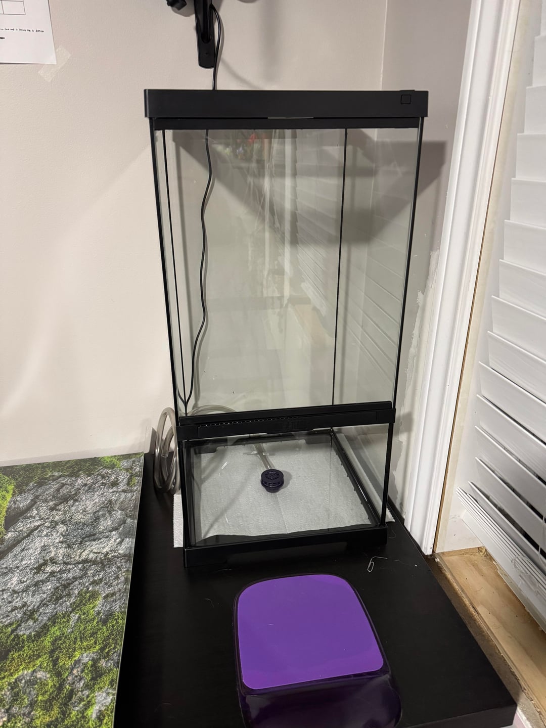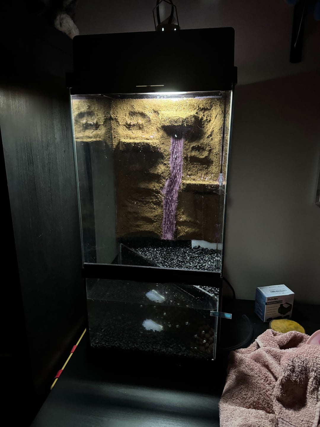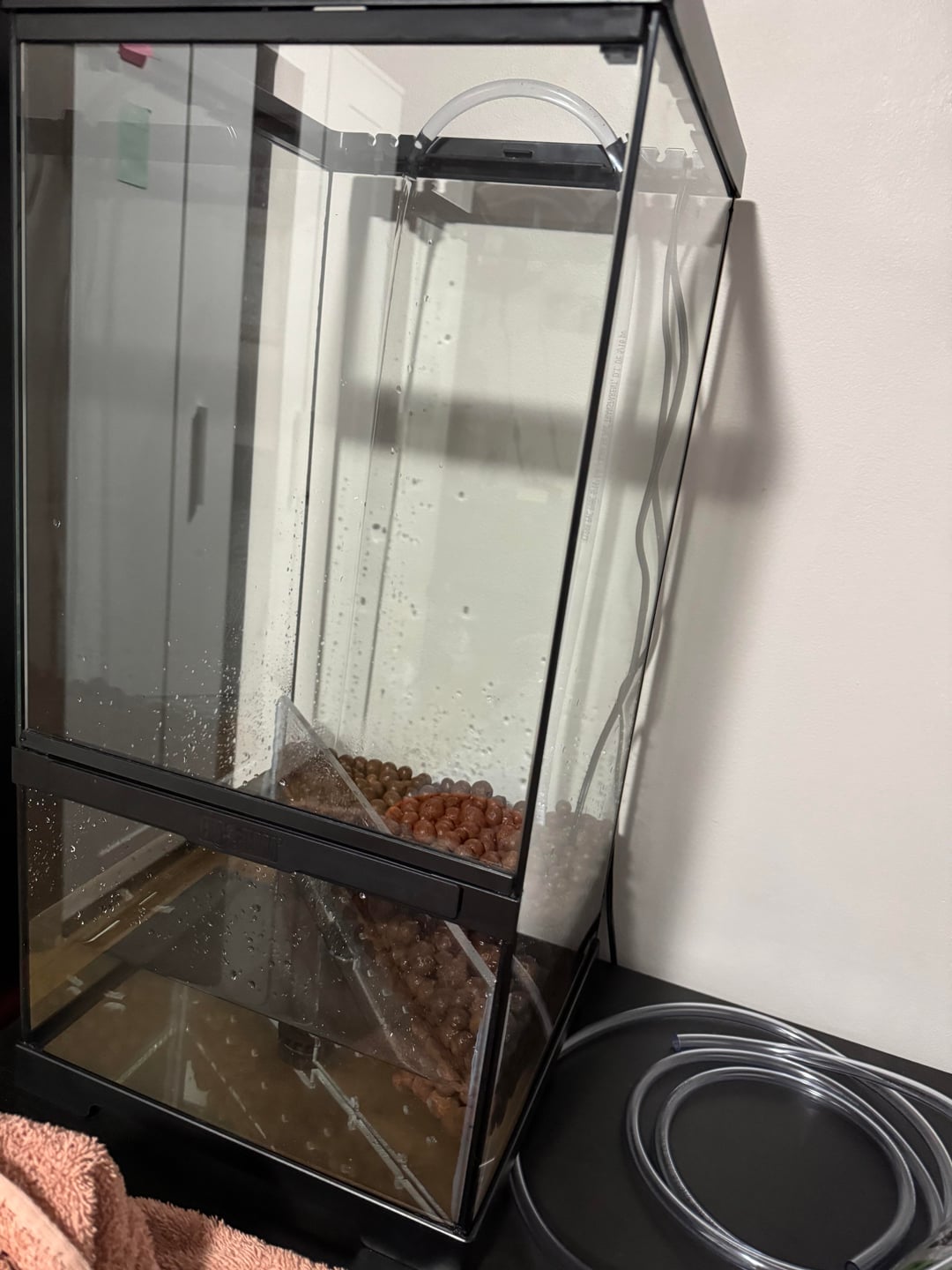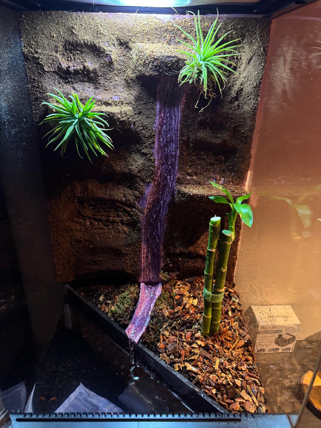 Building for a betta fish and gargoyle gecko. Going to add some vines and fake hanging plants for escaping from the water. Want to add a potted plant but not sure where. I do have a floating food and water bowl (that'll be put in last).