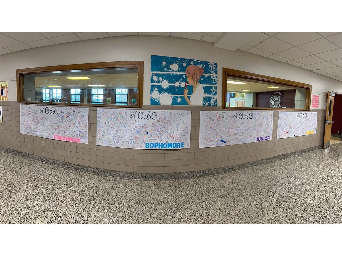 In physical education classes, students reviewed their current screen time and set goals to reduce it. Their goals were anonymously posted on banners inside the school.
