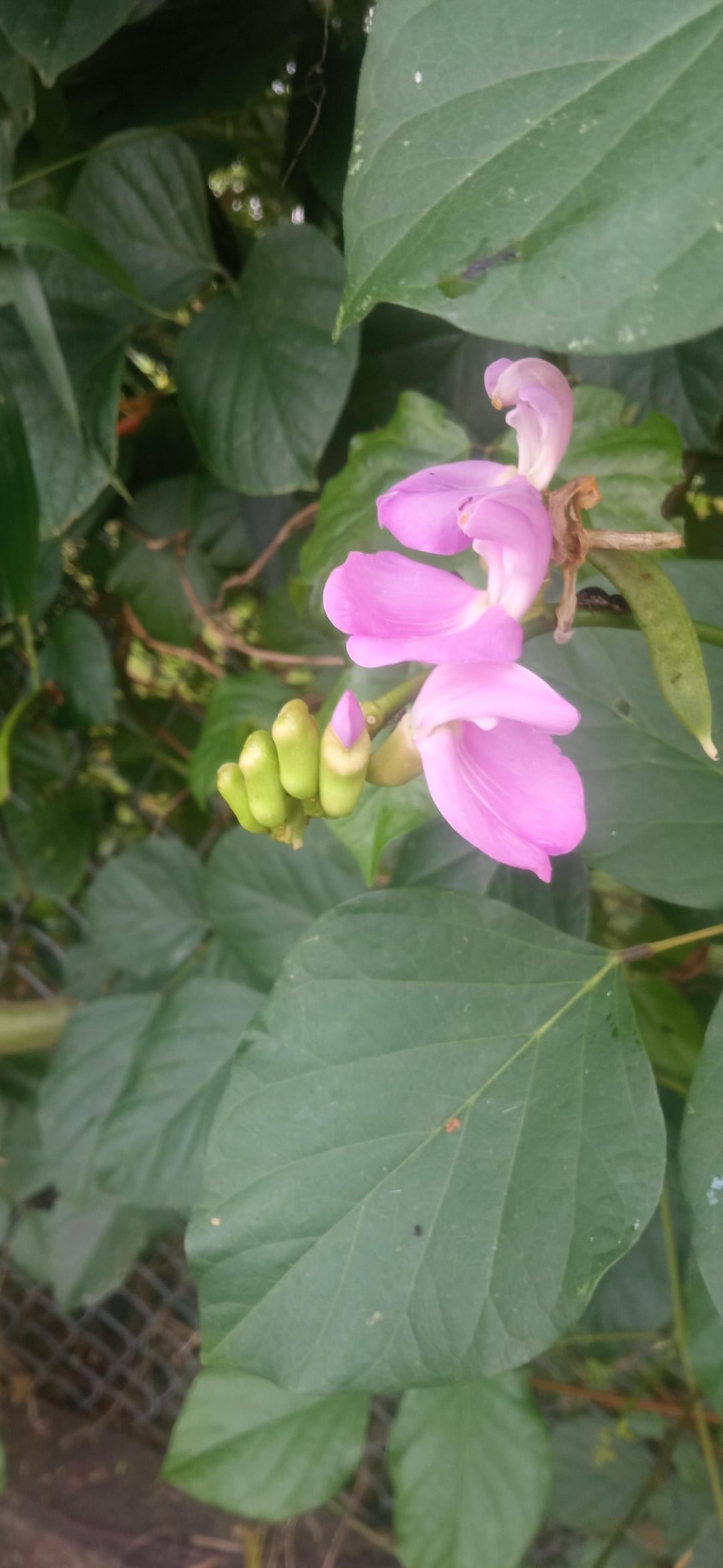 I compared it with common Fabaceae vines like Clitoria, Canavalia, Mucuna, Wisteria, Erythrina, and Strongylodon, but none of them match the combination of pink flowers + claw-shaped pods + thick pod walls.