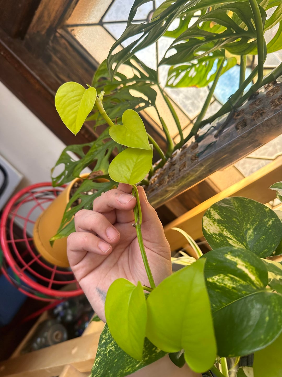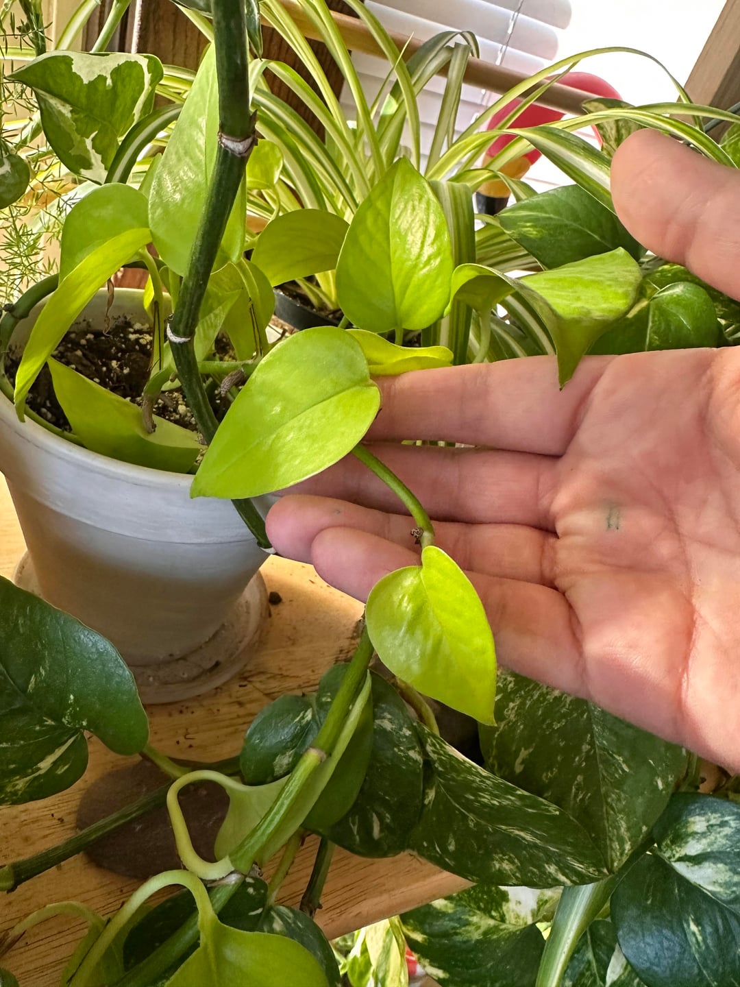 I got a few (I think like 2-3) cuttings of this neon pothos from my neighbor. It had big beautiful leaves! It was propagated in water and was in a sunny spot and began growing!! The leaves seemed normal size.