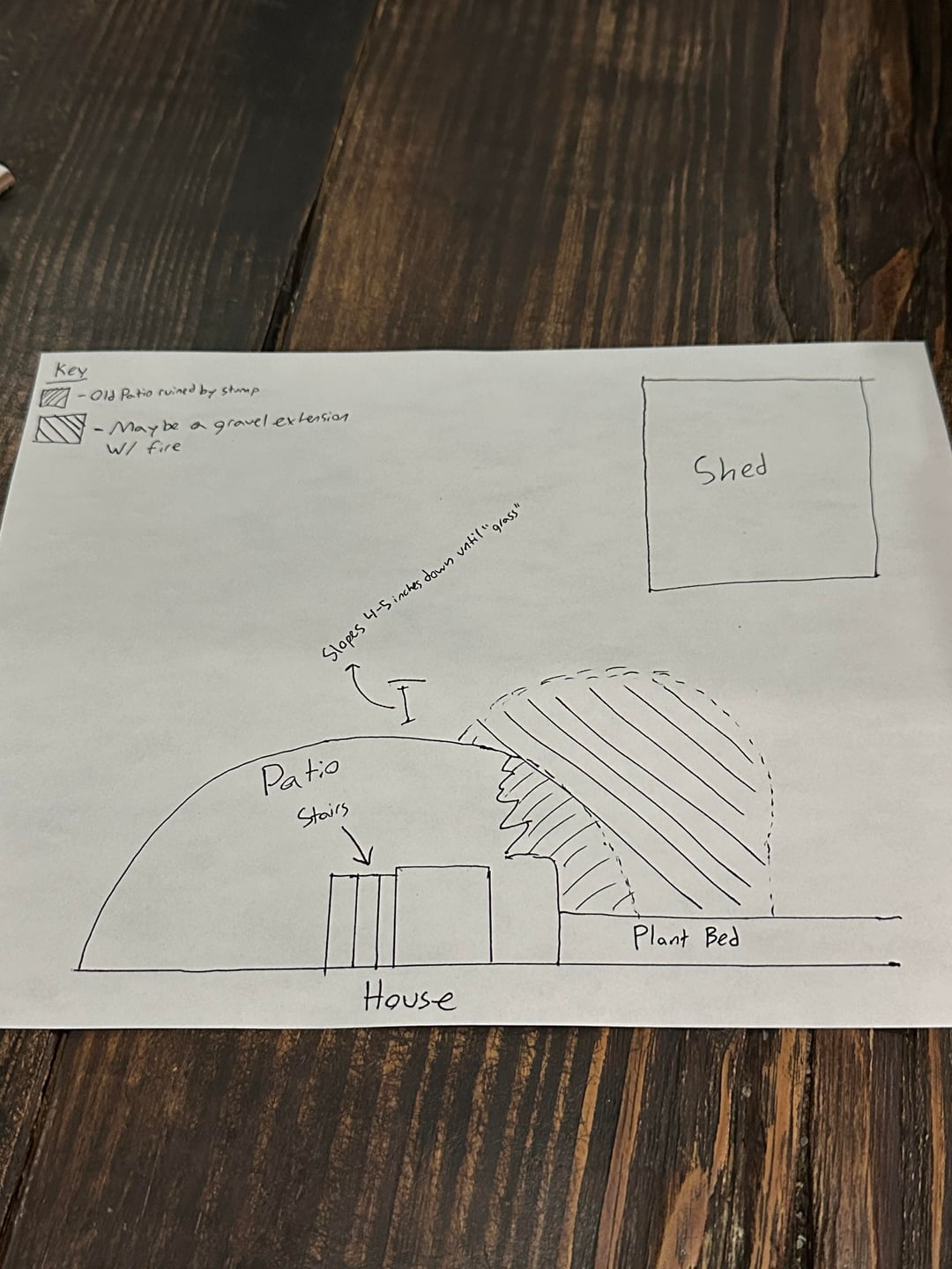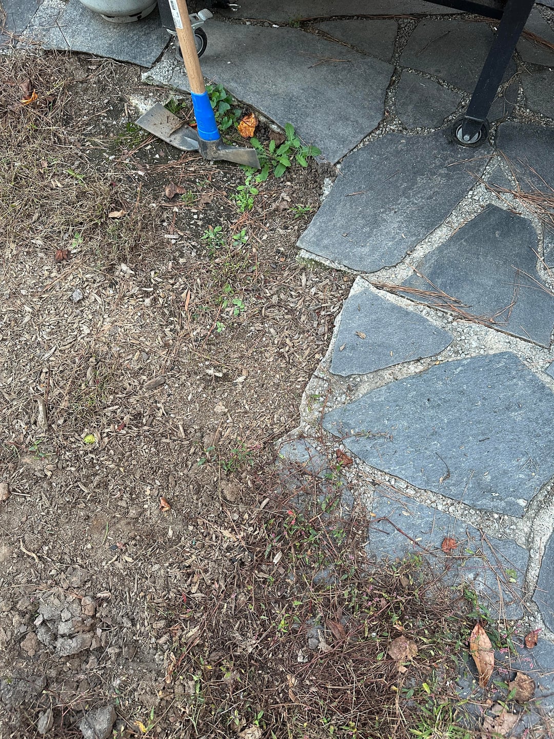 I’m currently contemplating adding a gravel extension to the patio to hide the broken parts and turn the old stump area into a fire pit. Does anyone have experience with a transition of materials like that? What gravel type would you recommend to minimize how ugly it is? Finally, does anyone have ideas for a “retaining wall” for the gravel as the grass/dirt currently slopes down around 4-5 inches from the patio?