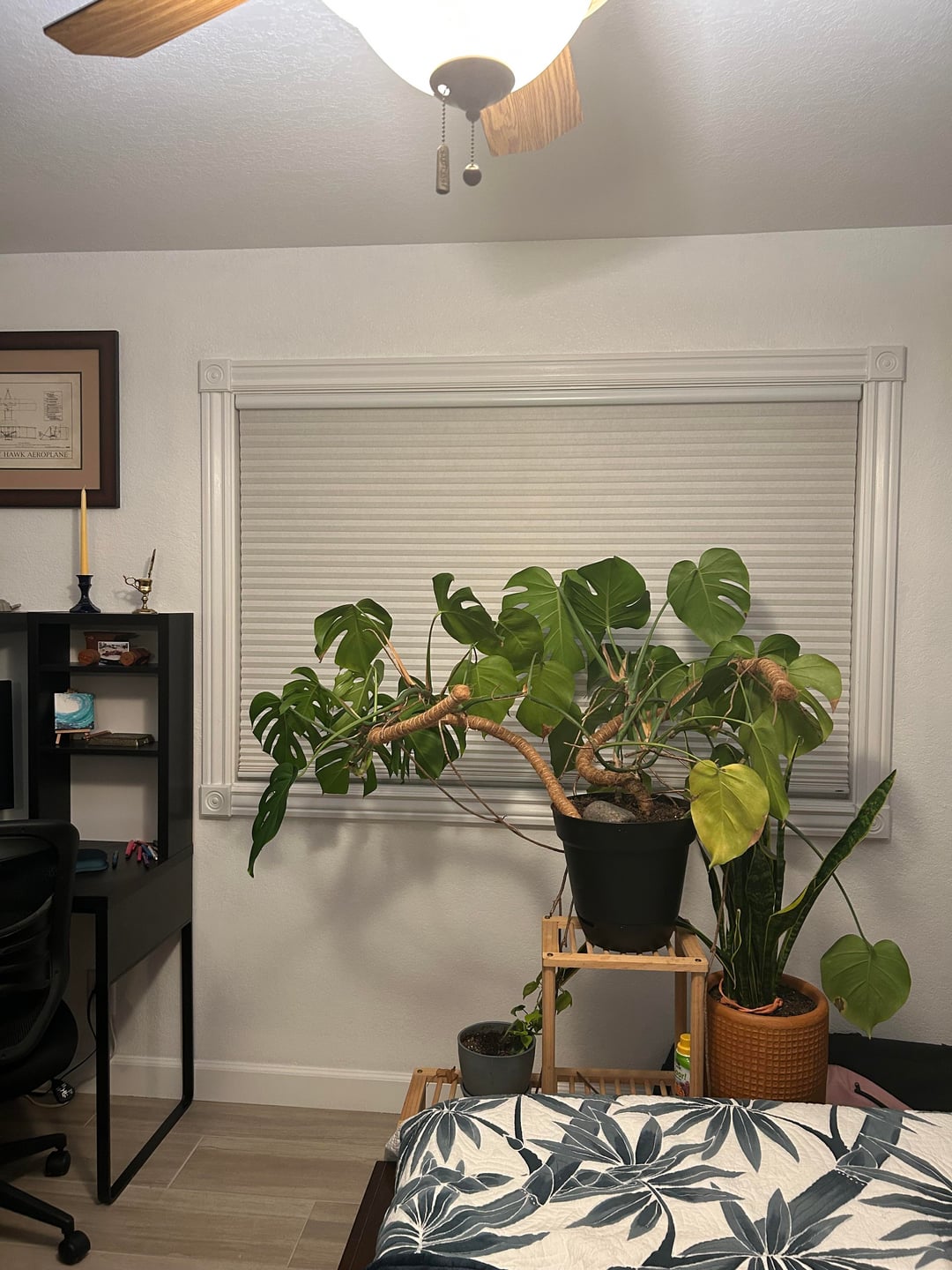 It lives in the spare room in front of this west facing window with the shades down, but I think it would look nicer if it was standing tall in a corner or somewhere where we can see the leaves thriving.