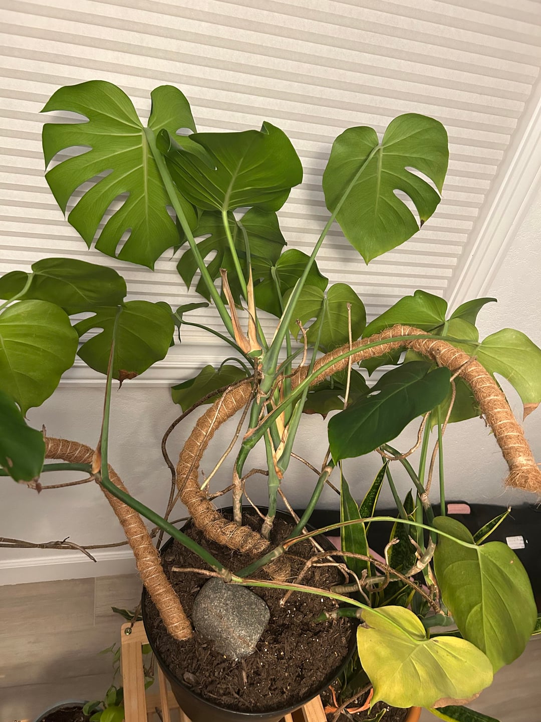 I have 2 moss poles, but as you can see in the first photo, it sits very forward out of the pot and is so heavy that it’s not very stable staying in the pot. I also have a rock in there bc it helped with manipulating the stems.