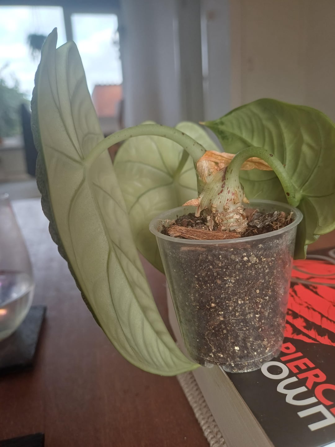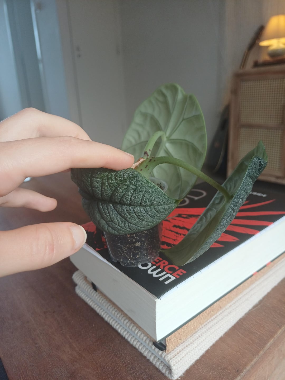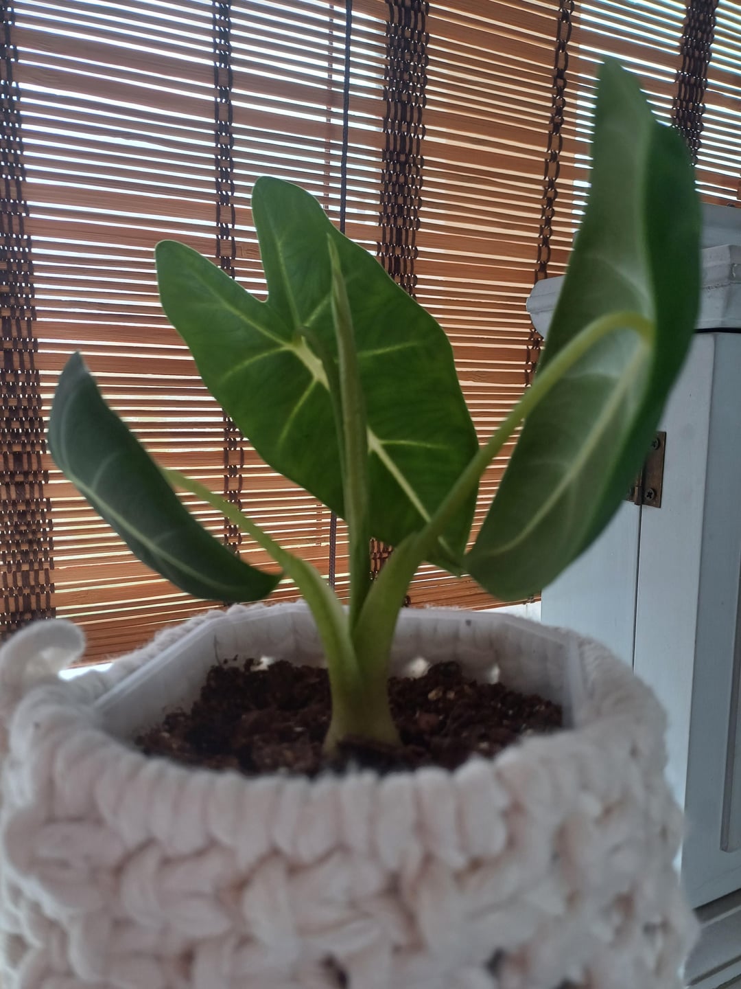 First I thought the plant was getting too much light because I know Alocasia's duck away from the light when it's too much, but one of the leaf has quite a long stem (1st picture), and when it's too much light they bent down at the top and not the whole stem right?(Like the picture of the frydek?)
