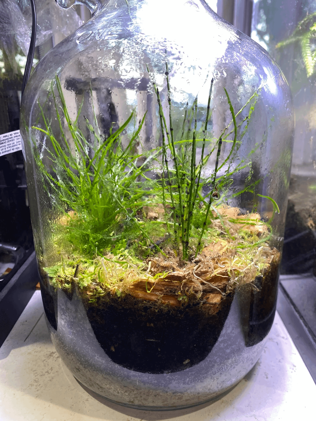 Ever since I watched that Cody Labs video from 2018, I’ve been obsessed with making my own as a paleo nerd. I’ve tried and tested several plants and inverts over the years, many of which I regret. Most plants either did not acclimate well, or would completely overcrowd a 1 gallon terrarium. I’m using biodude terra flora substrate. Many of the plants here are from the aquarium hobby but have adapted incredibly well. The Isoetes was a gamble but it has sent down rootlets to the false bottom after 2 months.