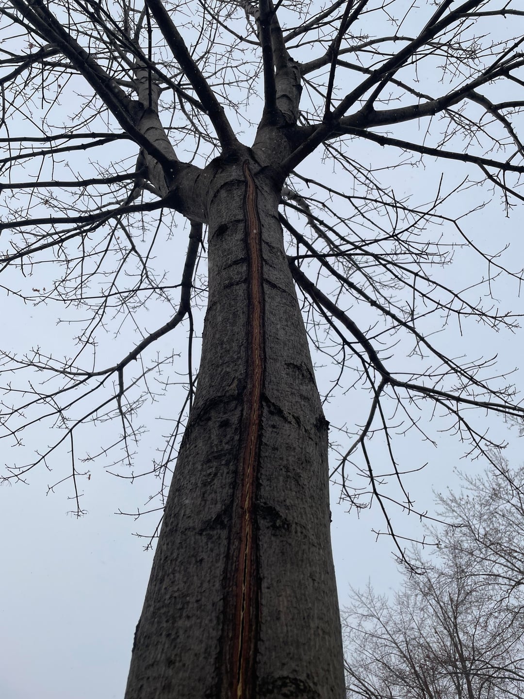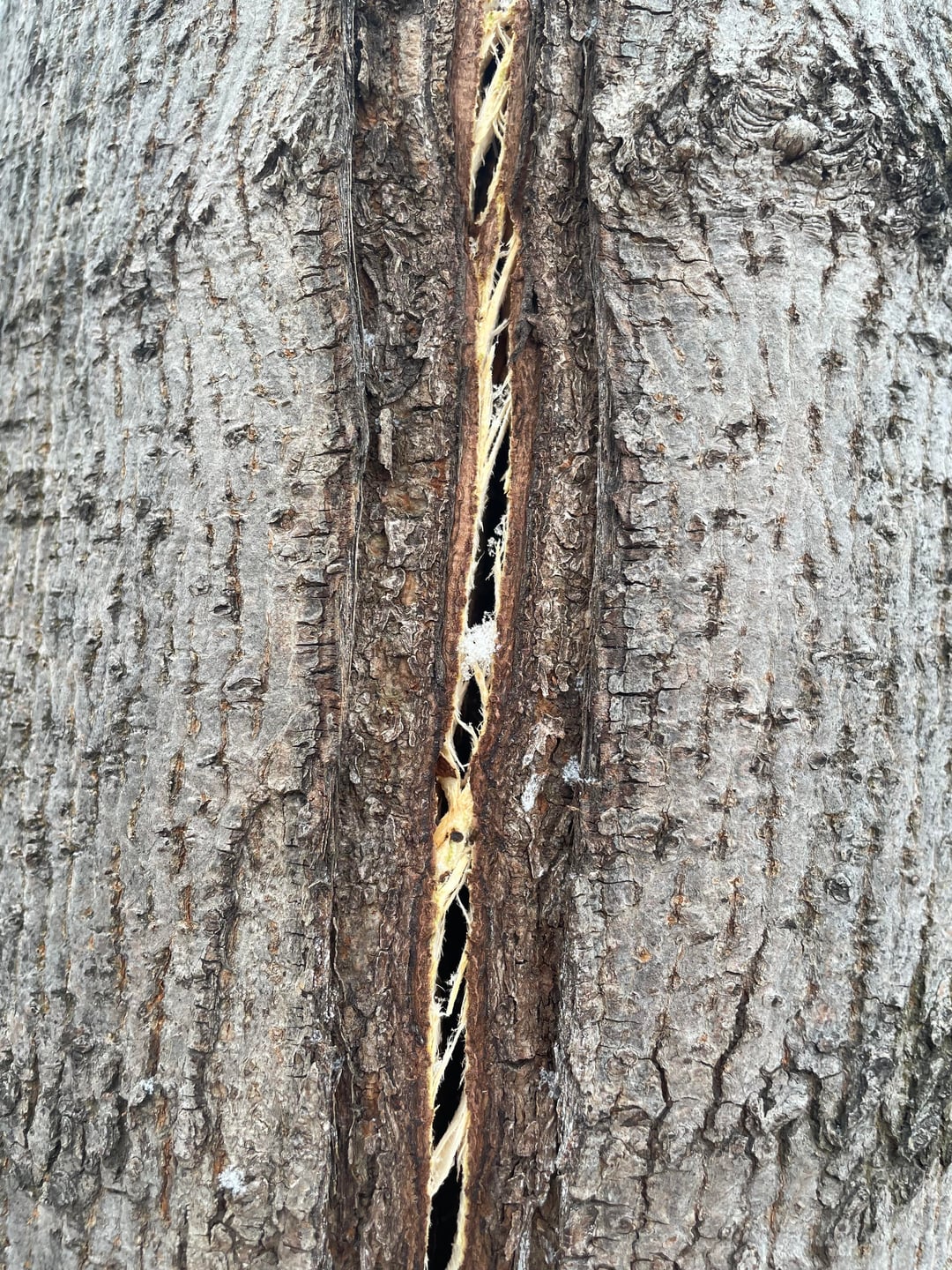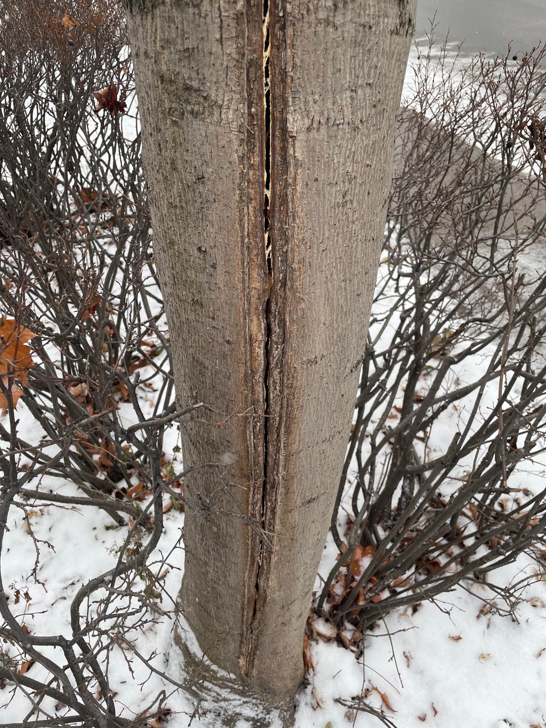 Two years ago we had a serious ice storm and this maple tree split from its base to its branches. I was concerned it would die, but I’ve been enjoying watching the seam heal more and more each month. It seemed almost fully healed until we had a -17c cold snap last week, when this fresh split appeared along the exiting seam.