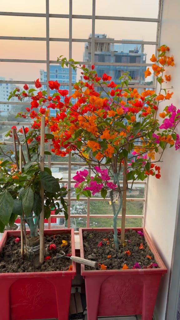 Sitting beside my six-color multigrafted chili variant bougainvillea on my balcony truly fills my heart with joy. When I gaze at it, I feel like I could just lose myself in dreams. This plant has been a labor of love for quite some time. I chose a local rootstock with strong immunity that’s well-suited to our environment, ensuring it’s disease-resistant and blooms abundantly. On this rootstock, I carefully grafted six different chili bougainvillea colors from around the world. Alhamdulillah, the grafts took successfully, and now it blooms year-round, making my balcony feel like a dreamy little garden oasis.