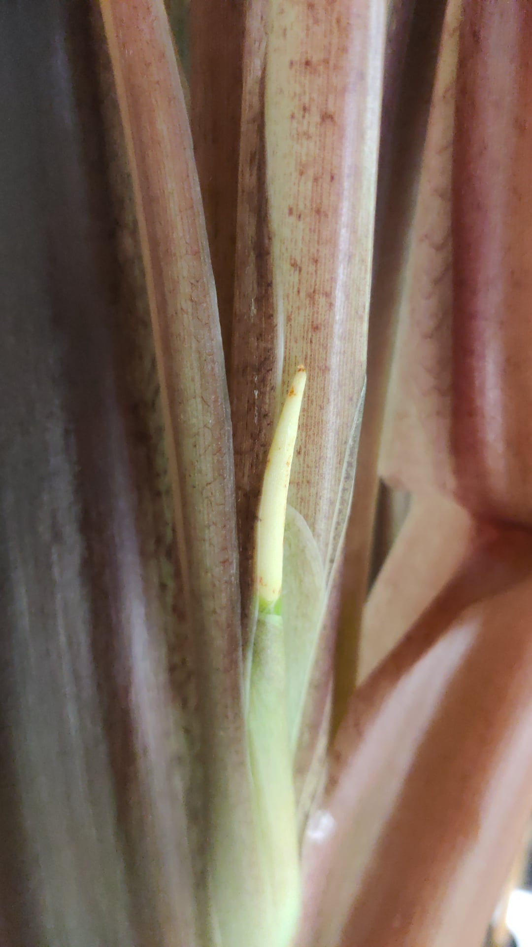 Has anyone experienced this before? My Princess started to develop a inflorescence and after a while she decided to grow a new leaf at same time. This newest leaf somehow pushed another much small and under developed inflorescence from a stem.