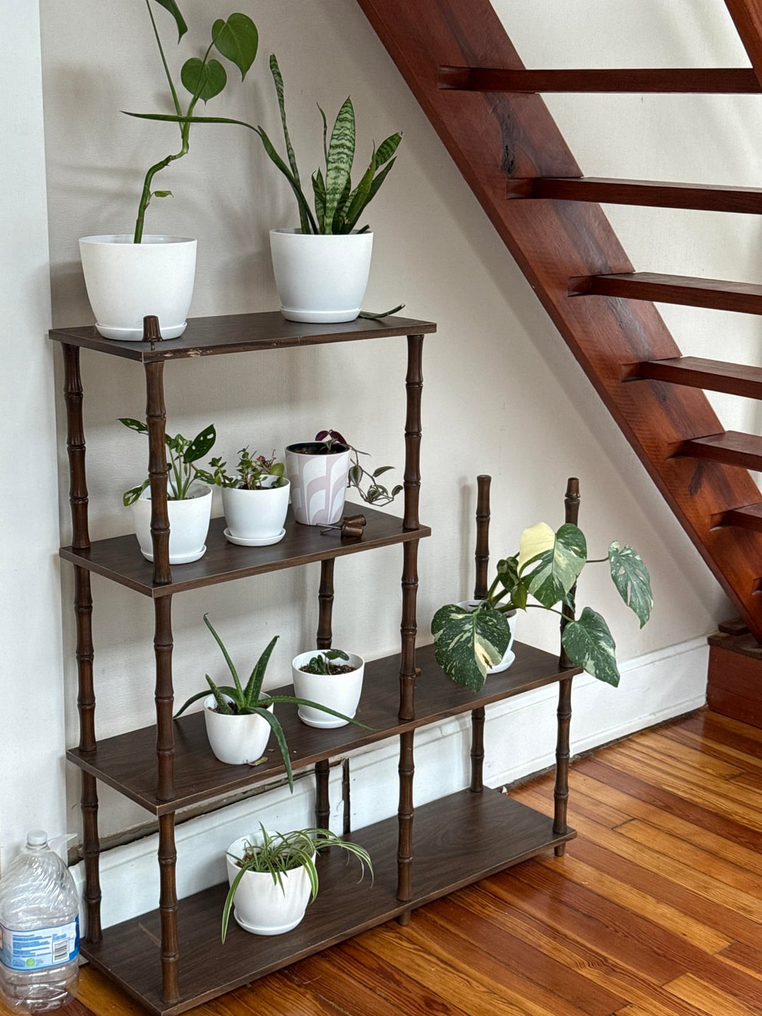 It appears that you have cats, they will probably attempt to jump from the stairs down onto the plant rack using it as a fire escape.