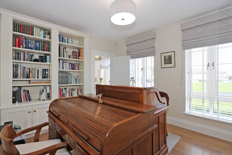 The second front reception room has built-in shelving and is used as a library/home office but could serve as a playroom or additional living space. Off the kitchen at the rear, there’s a utility room, and off the main hallway is a guest WC, which has a Chinese theme with quirky, colourful wallpaper.