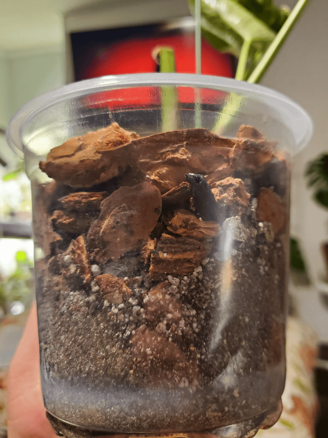 This little has been given me trouble. I had to reroot after it rotted out on me but I watered propagated & it grew awesome roots back in August. I wanted to use a 50/50 mix of soil & orchid bark, I also through in warm casting, perlite & vermiculite/pumice but all the soil just moves to the bottom. I figured to just remove the soil but I've never not used some soil in any of my plants before?