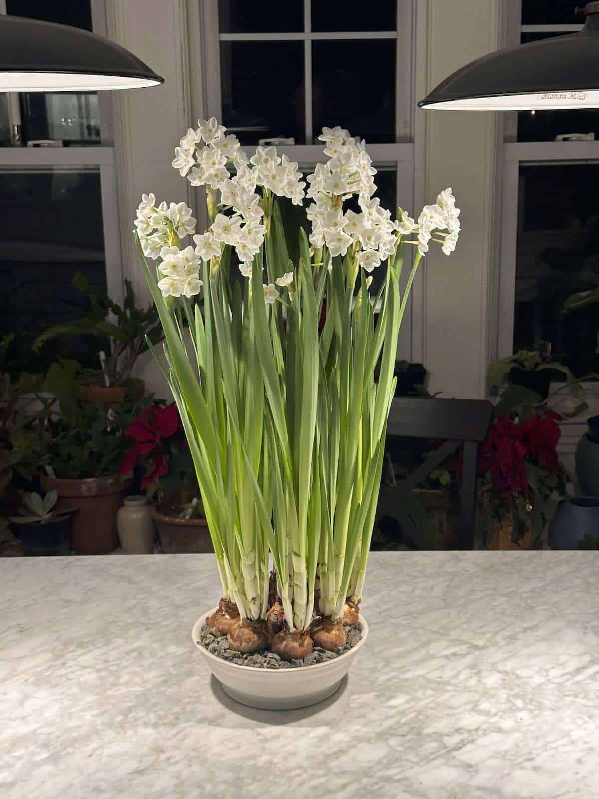 And you know what? If you’re listening in Arkansas or Louisiana, they’ve naturalized outdoors, or Southern California, so they are a Narcissus; these are a daffodil, basically. So we know the way we’re growing them, putting them in rocks or in a vase with water and alcohol, whatever is not the best conditions to treat your bulb if you want it to rebloom again. If you do want it to bloom again, you need to plant it like a real Narcissus, like 2 inches deep in the ground, in potting soil, and fertilize it after it’s bloomed. And it is a lot of work.