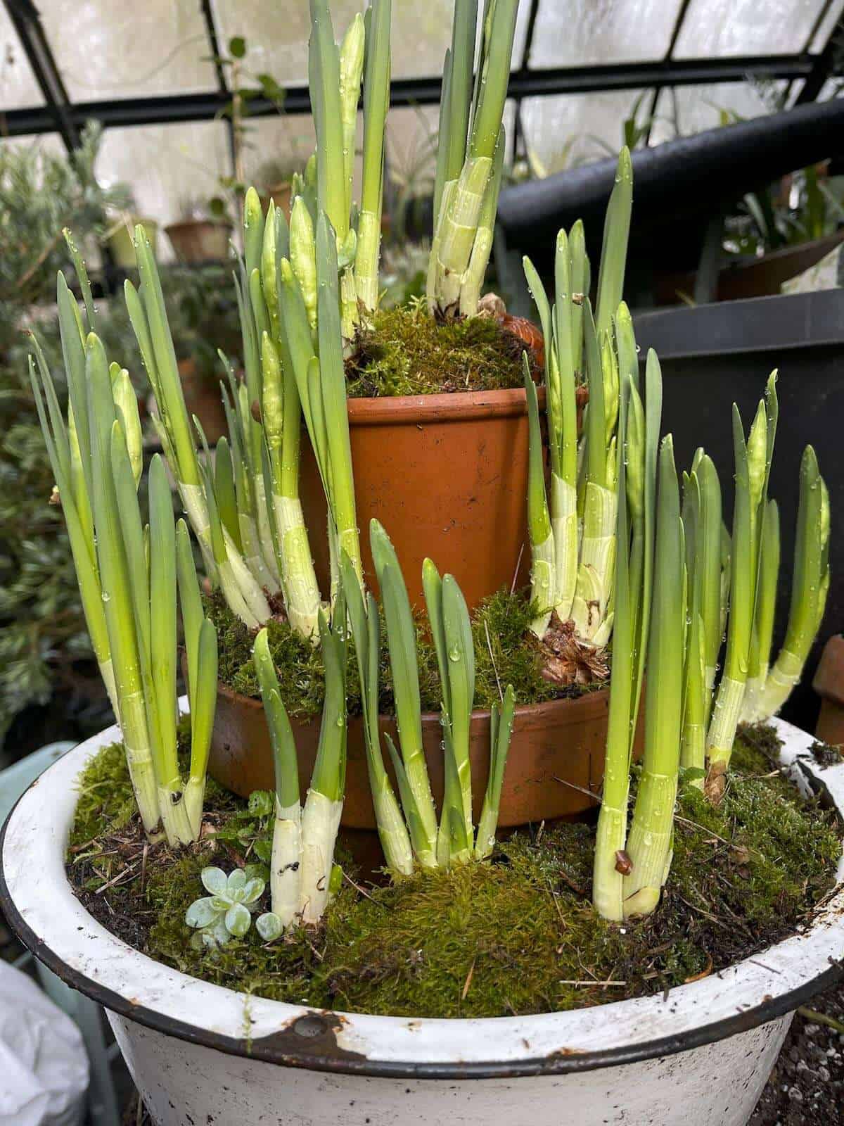 Matt: Yeah, I did mine yesterday for Christmas, but I also have to sort of time it. It depends how warm your house is. So I have them indoors now in the house. I planted big urns with a dozen bulbs in each. And then I do some individual ones. And these are just for my Christmas table. But if they start to grow too long, I bring them out to the greenhouse because it’s cool in there. It’s 40 degrees, they’re getting full sun. I don’t need to do the alcohol treatment because under those cool conditions they gross stumpier and shorter.