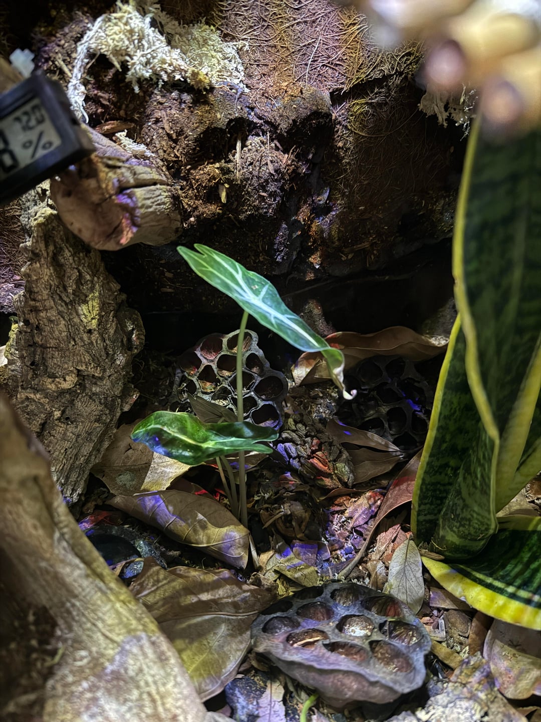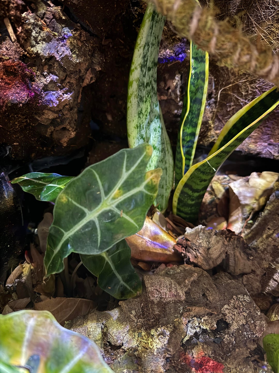 Planted this alocasia poly a week ago and it’s looking really rough. I know yellowing leaves is a sign of overwatering, but the soil feels quite dry. I’m really struggling to keep plants at the bottom of my tank alive and I fear it’s because my grow light is not adequate enough for a 36in tall enclosure. Please let me know what you think and if these plants are salvageable