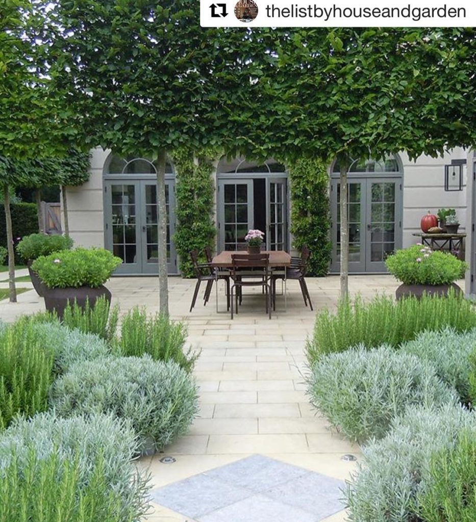Thank you so much @thelistbyhouseandgarden from @richardmiers for inviting us to host your Instagram feed for today. It’s been great fun! Our last photograph is of the dining terrace area of a client’s large garden in Surrey. The starting point was defining the space using the pleached hornbeam trees and swan English sandstone. Once that was established paths to and from focal points and vistas were created to lead one from area to area but at a cross roads the Belgium blue limestone was used as a full stop to slow one down visually. The four symmetrical herb beds were planted with Lavender, Rosemary and Thyme and add a billowing softness to the whole arrangement. Natural looking earthy coloured containers were especially sourced to tie in with the colour of the dining chairs so there is a unity to the space and a specially commissioned table made of 50-year-old teak by the talented @jeremypitts.co.uk. To the left you can catch a glimpse of the flower border that wraps around the entire outer area of this part of the garden. Once again thank you @thelistbyhouseandgarden for allowing us the honour of taking over your feed. We’ve had a great day and we hope you all have too and hopefully see you at the @houseandgardenuk Festival at Olympia at the end of June.