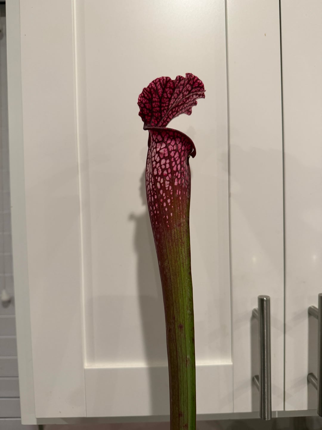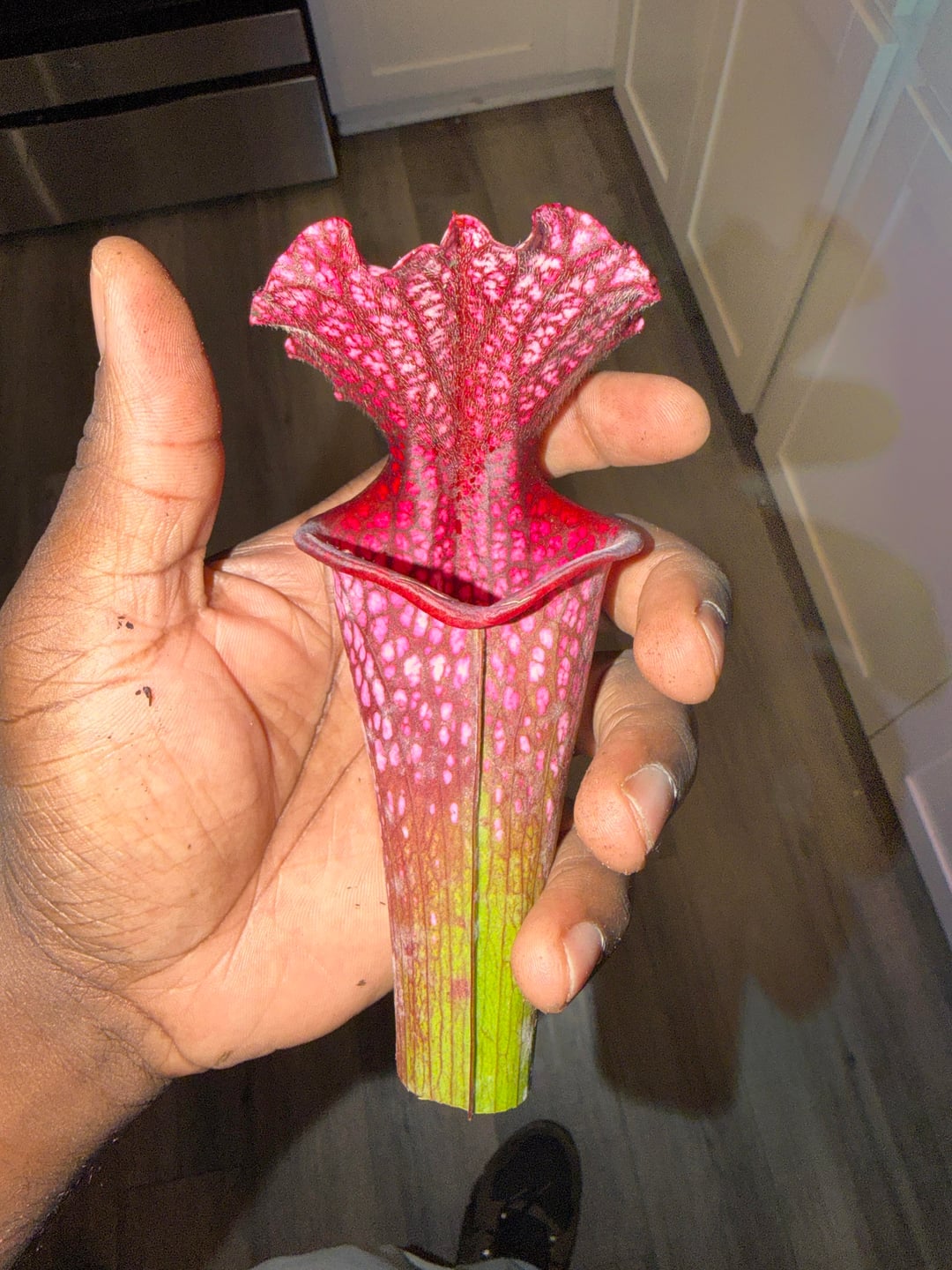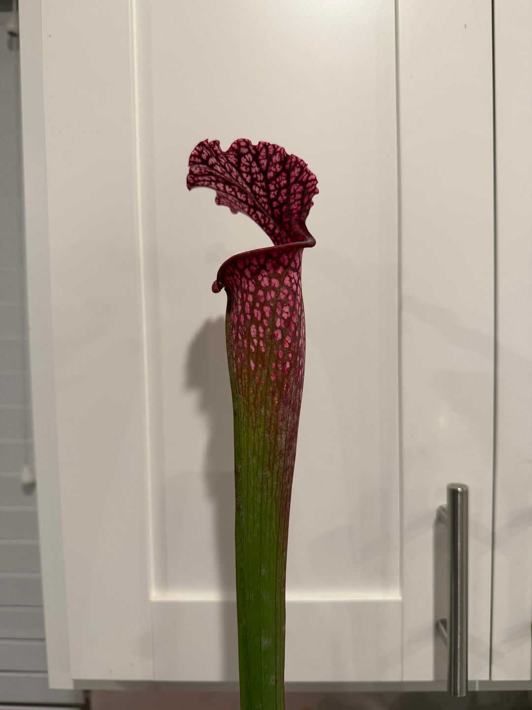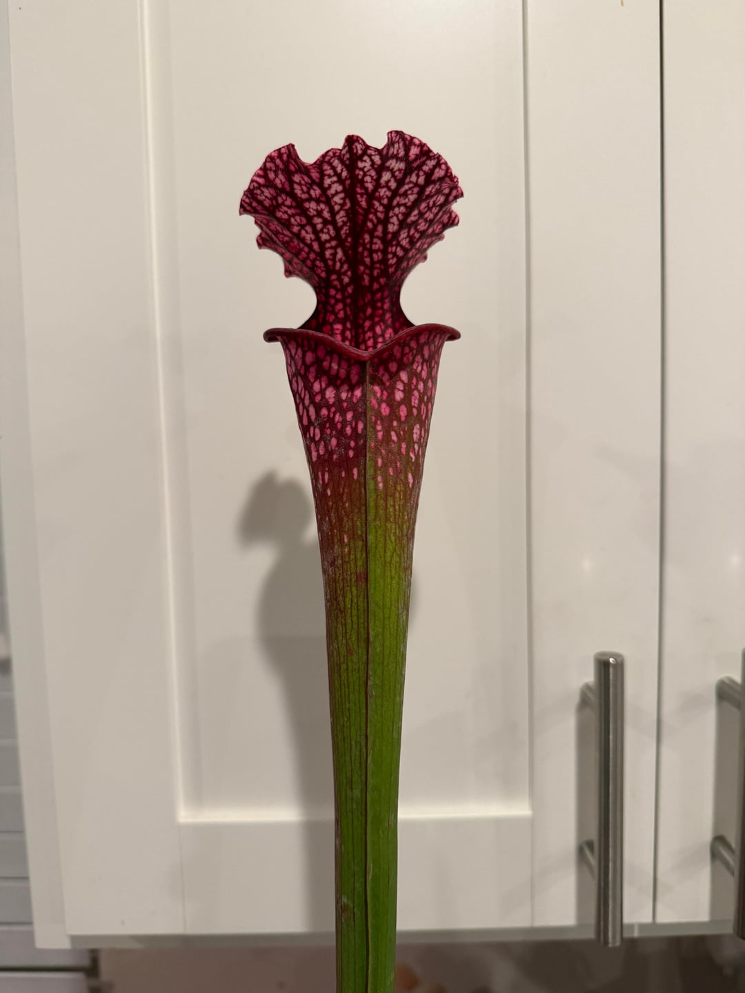 S/O to @drop_zone_101 for the unexpected early Christmas present!!! S. Leucophylla ‘Purple Lips’ x ‘Royal Ruby’. He and I live in the same climate so it’s nice to see a plant that holds traps THIS PERFECT deep into the growing season like this plant. We’ve already had a few dips into the low 20’sF in our area. This trap was 25” before I cut it off.