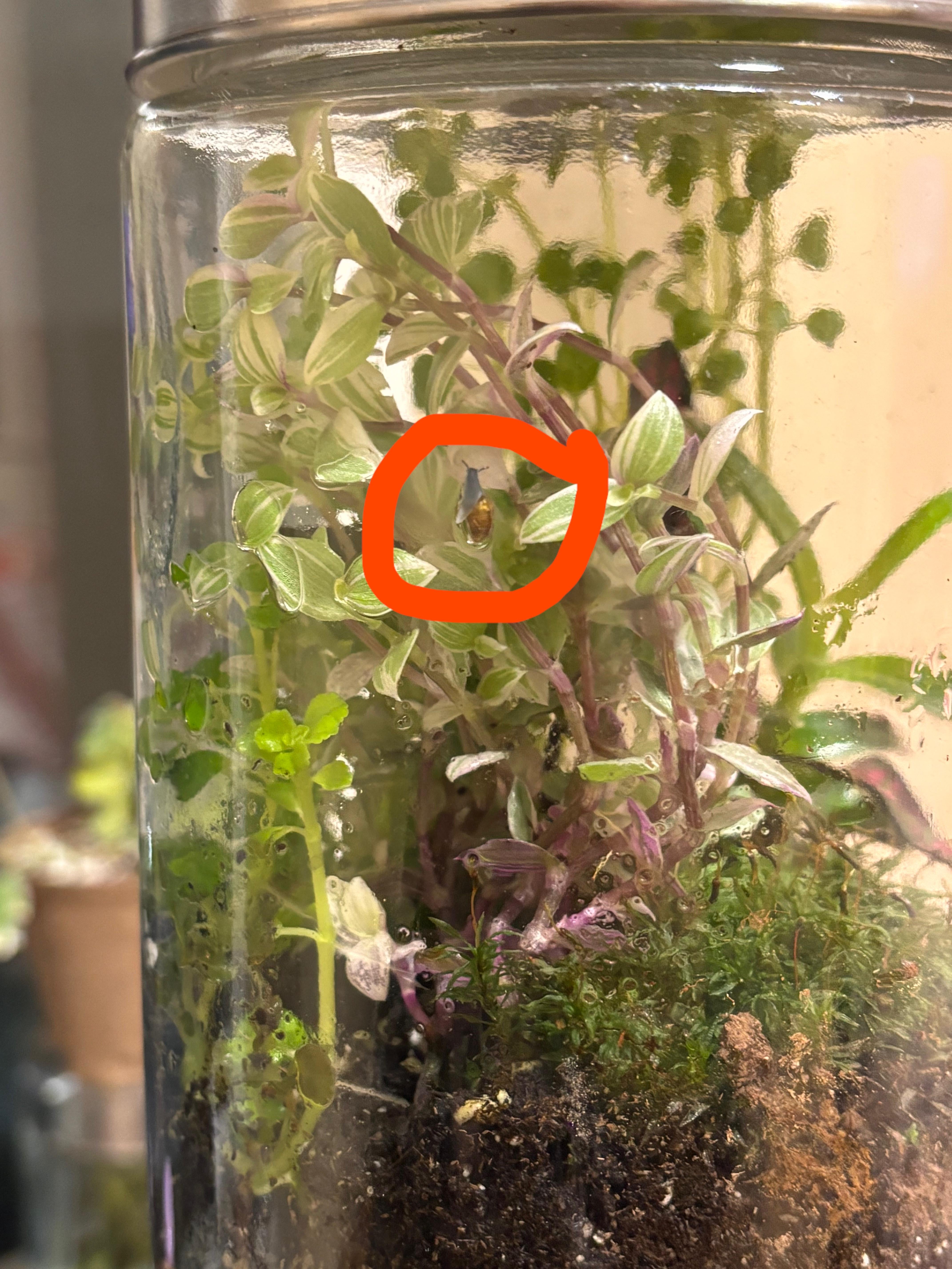 I don’t know all that much about terrariums but I do have this one I made a few weeks ago now, and I was just looking in it and found this little snail. I’m wondering what I should do about it, if anything. Will it harm anything? Can I just leave it be?