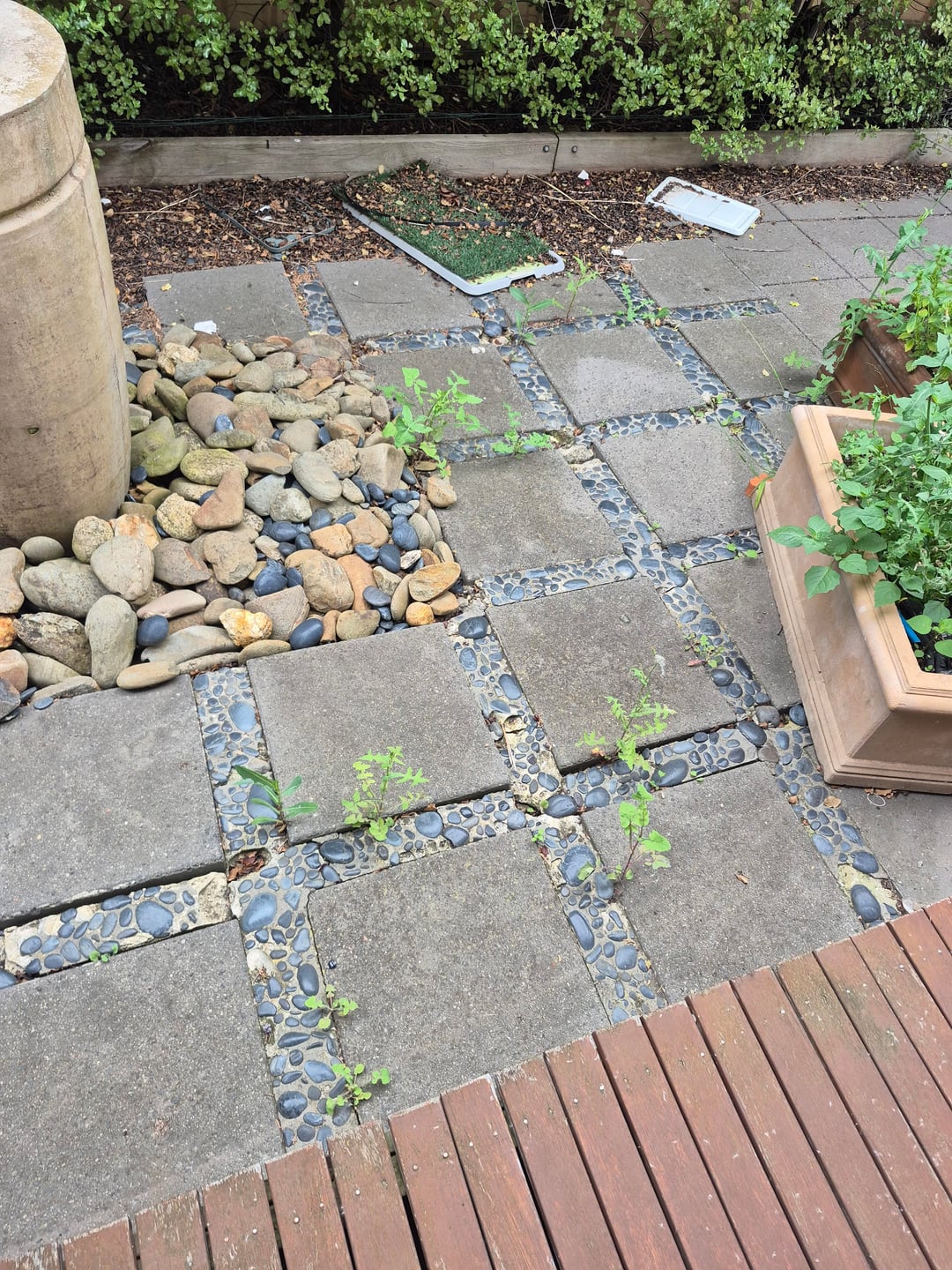 Then, rent a weed flame torch from the local hardware store (Home Depot, Lowes, Hornbach, Bauhaus, etc) and torch what’s left between the tiles, not doing the ones directly near any wooden fence, or other flammable major object.