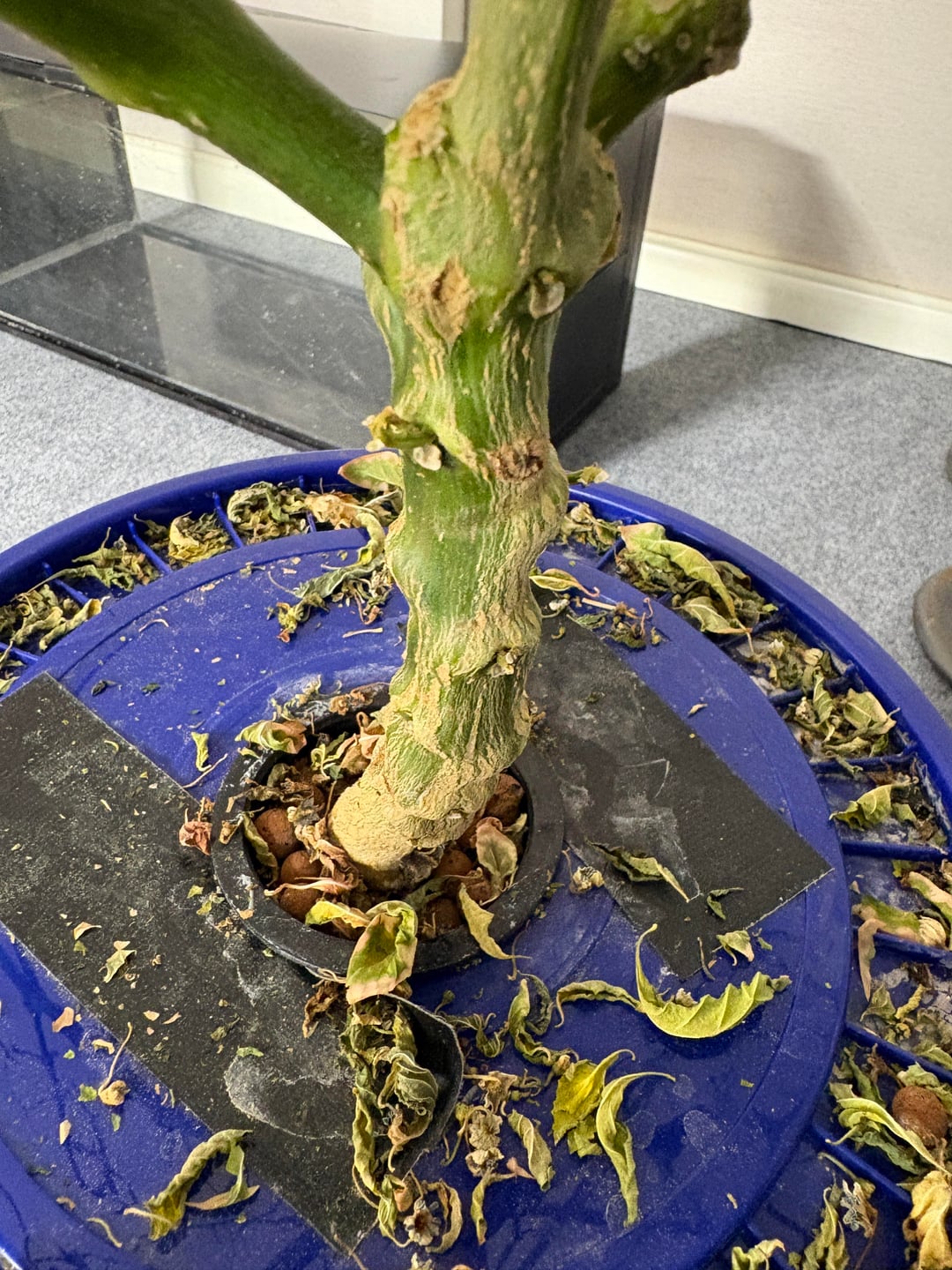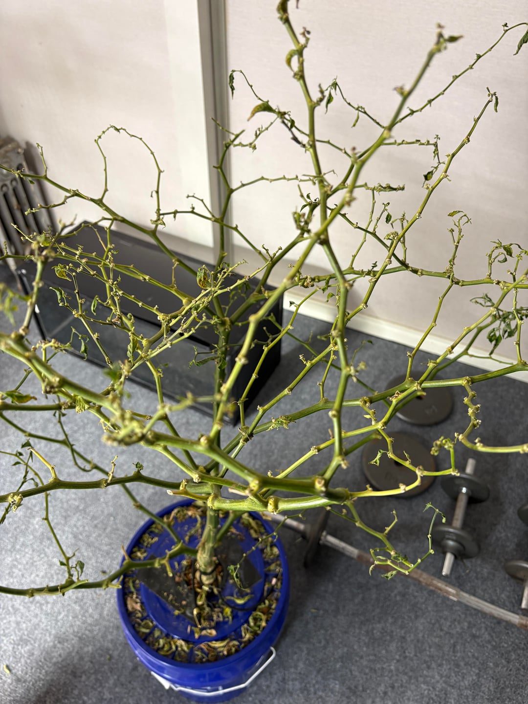 About 3 weeks ago, I had to go away for a few days and I topped up the nutrient in the bucket for this habanero plant pretty good before I left. This thing was producing like crazy, so it used up all of the liquid by the time I got home and dropped all of the leaves. I added new liquid right away when I saw it. The roots still seem ok, though not quite as white. The main stem is still moist just doing a scratch test, bigger branches are still green and I trimmed off quite a few smaller ones that turned brown but I haven’t seen any new growth. I’m just wondering if it’s worth the effort. If not, I’ll just transfer a different plant in a smaller bucket into this one.