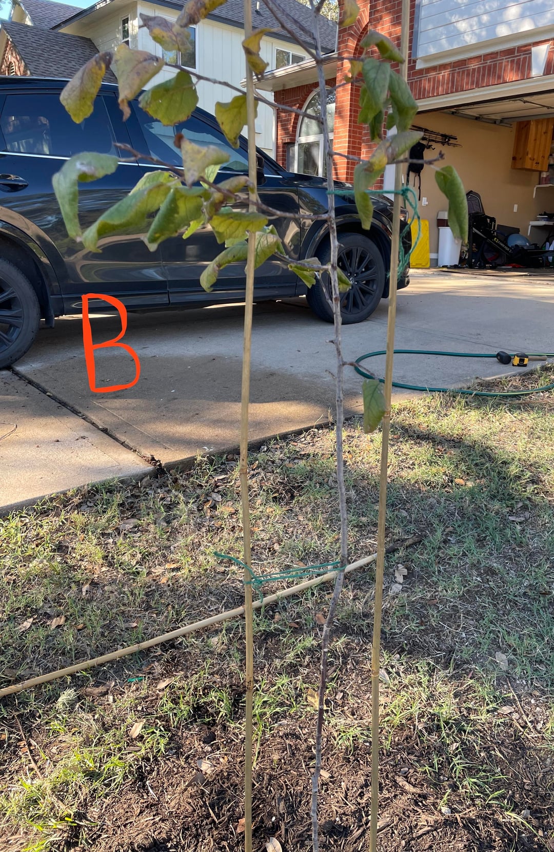 I initially staked with one support (image A) – this lets the trunk move around much more with the wind, but does nothing to correct the bend.
