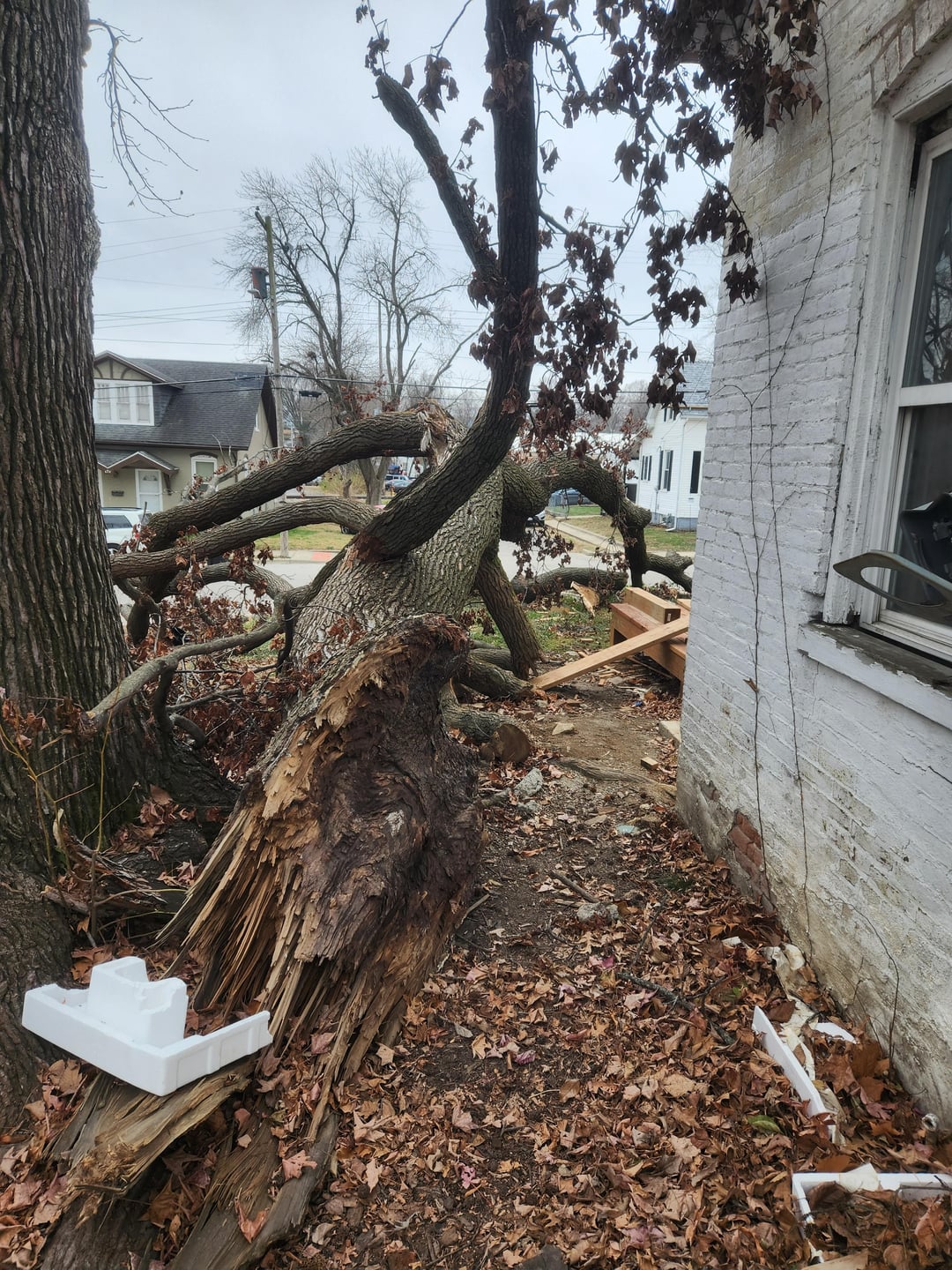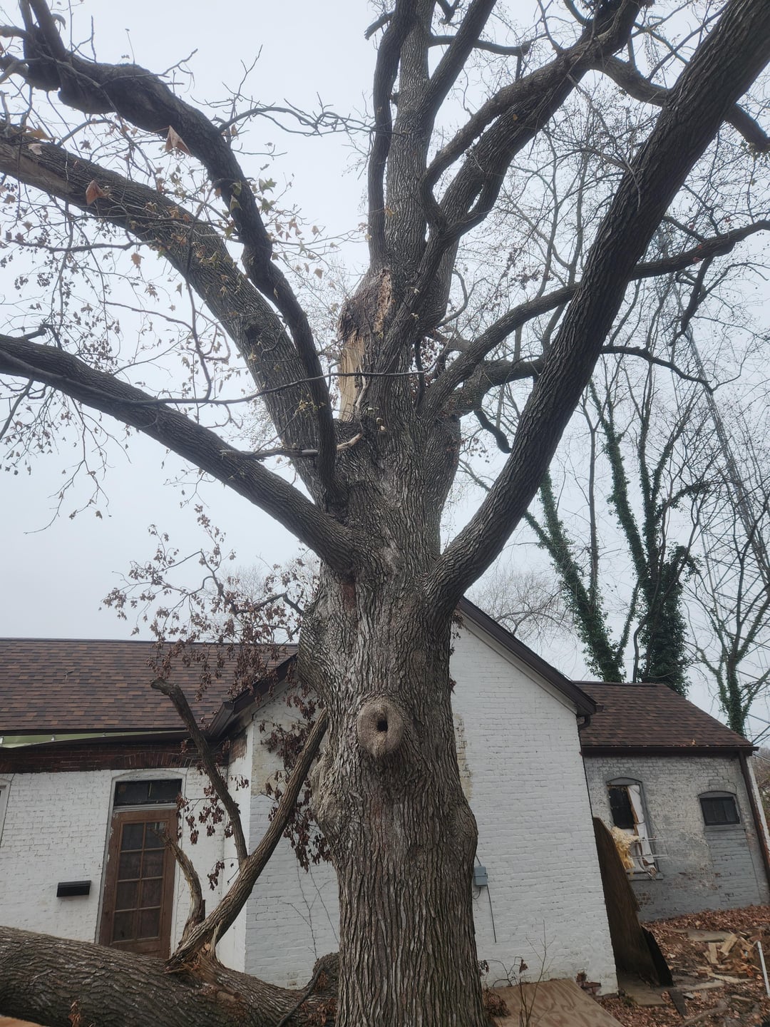 Most of risk has broken off and safely landed on the ground without damaging the house. Some trees are very considerate in that regard when they fail. If I were hired to deal with this I’d cut the longest higher branches way back, ideally at any remaining forks and give it a new compact balanced structure and then I’d return 2-3 times times each growing season to shape all the sprout growth and in a decade it’d be one of the most beautiful trees in town. I’ve done this successfully many times!