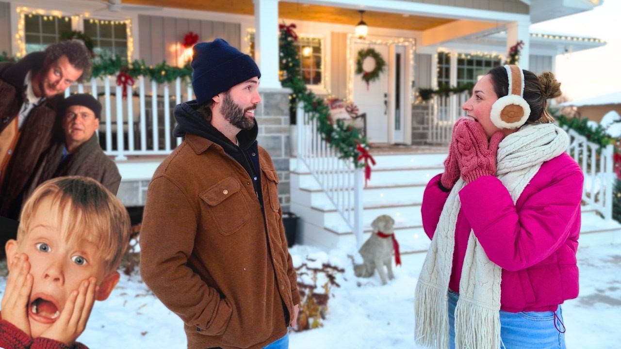 Do you have a favorite Christmas movie? The the the the Grinch. Oh, it’s changed over the years, but I think The Grinch, and we always quote it, but this video has nothing to do with The Grinch. Oh, well, that’s my favorite movie. My favorite movie is also The Grinch. But my second favorite movie is Home Alone. So, we had an idea to turn our house into the house from Home Alone. They don’t actually get to see it yet. You have to keep watching this video. It’s just all pixelated. We’re just We’re here sitting here clear. Everything else is pixelated. Actually, the dog is unpixelated. I just love that movie. I’ve always loved that movie as a kid. All of the white lights on the house, the whole house in general, the decor, the vibes, the being left alone at Christmas time. Nothing like it. Yeah, the Home Alone house was always just impressive. it was. So, in order to make this happen, we had to do some research. We rewatched the movie, we took notes, and then got down to planning. The house in the movie uses warm white Christmas lights and a wreath on the front door, which is simple enough, but we could do better than that. Now, at quick glance, our house looks nothing like the house from the movie. So, we will have to work some decorating magic to make this happen. Keep the change, you filthy animal. Cheapcate. Bye-bye pumpkins. Let’s review the plan for today. I’m thinking garland, lights, decorative pillows, and then of course we’re going to need Harry and Marv and Kevin Mallister. What am I missing? I’m actually not reading a list. It’s the grocery list. Ginger ale, case of pop, Alfredo sauce, and fetuccini. If we can pull this off, it’s going to be some good Christmas decorating. Okay, let’s get started. You feel the animal? Let’s review what we have. White Christmas light. Oh, white Christmas lights. Santa. And then it’s more Christmas lights, more wreaths, timers, garland, and then artificial trees for the porch. We’re We’re what? We I was going to say we didn’t buy any Christmas decorations for the porch this year because I spent the budget last year. You only buy this stuff once anyway. You reuse it every year. That’s right. We didn’t have any before, so we had to get it. So, we’re reusing everything we used in last year’s video, plus a little more, which you guys will see very soon. What’s the little more? Harriet. Oh, right. Right. And Kevin Mallister. Right. So, because I blew the budget last year on Christmas decorations, I already have the command hooks from last year around all the windows. For some reason, when I think of Home Alone, I thought that they had wreaths on all the windows, which I guess was um what do they call that? Not a placebo effect, but a deja vu. No, it’s when you remember something that didn’t actually happen. Uh, narcissist. No, baby. Andrew just learned what a narcissist is. Okay. How’s it look everybody? Let’s ask the audience. Last year when I hung the garland from the stairs here, all of you were saying that I should have hung it on the inside of the railing instead of on the outside the way that I did it. Um, so I did plan to listen to you, but if we’re not drooping it this year, I could just do it straight along the top. Look at these dogs when they have to be involved. He’s got his coat on. Whoa. Jeez, that scared me. I thought you fell. How did my grade 8 grand photo get out here? Can you just help me with getting this into that pot? Cute. Okay. Okay, those work. Cute. So, one of the things about Mallister’s house is they put lights in all of the trees in the front of their house. So, we’re going to try and recreate that with the two strands of lights that we have. Merry Christmas. Oh my gosh, I forgot I bought those last year. I was so excited because it was our first Christmas after finishing the renovation. So, I did do a little bit of spending because we had more room than we had in previous years to decorate. Like, we never had a front porch before. So, I splurged a little, but I’m glad I did because now I get to use everything this year. Up we go. While Andrew’s on the roof, I want to give you guys a really quick bow making tutorial. You can buy the big spools of ribbon from any craft store. Usually cheaper than it would cost to buy a bunch of pre-made bows. If you’re like me and you need a lot of bows in your Christmas decorating, it is a hack that I learned online myself, but it does help in creating really beautiful bows. You could use it in your decorating or on your presents. It’s kind of odd, but the bigger you space your feet out, the bigger the bow can be. So, you sit on the floor, put your feet on the one side of the ribbon, you crisscross your ribbon over the top of your feet, and then bring it around to the back. You’re gonna tie the ribbon around. It’s sealing it all together. Okay. So, you’ll have one tail at the top, one at the bottom. You’re gonna bring it around to the middle and then tie a knot, which seals your whole bow together. Then, when you pull it off of your feet, you’ll have to do a little bit of juzjing with the ribbon. And then with the middle section, just kind of pulling it, making it a little bit fuller if needed. And then I like to take my ribbon and trim the little tails. Fold it in half and create a cut upward from the corner. So it creates a really pretty detail on the bottom of your ribbon. So cute. You okay? I think so. Oh my god, he’s so heavy. It’s so cute here. We have to keep it at the front of the house. I want to look at it every day. It looks like a winter wonderland. I wish it would stay like this by the time you guys see the final reveal of this video, but it is all supposed to melt by like tomorrow. But in the meantime, we have a little bit more decorating to do. We have our Aly statue that we got off Facebook. We were watching Home Alone the other night on Christmas Eve when Kevin is putting out his cookies f