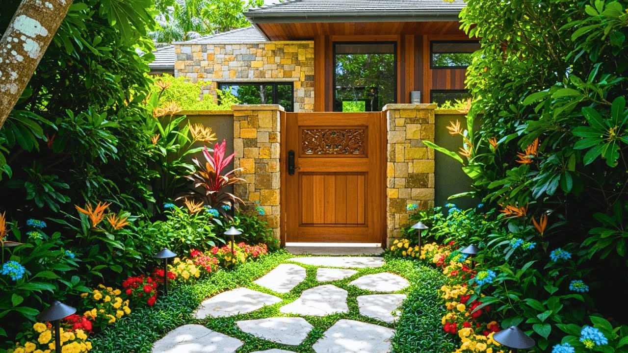 From magical garden gates wrapped in rich foliage to colorful tropical arches that create a luxurious welcome, each design brings a unique blend of creativity and practicality. These compact yet captivating spaces show how even the smallest front yards can be transformed into breathtaking tropical escapes complete with warm wood textures, vivid plant layers, and perfectly balanced color palettes.