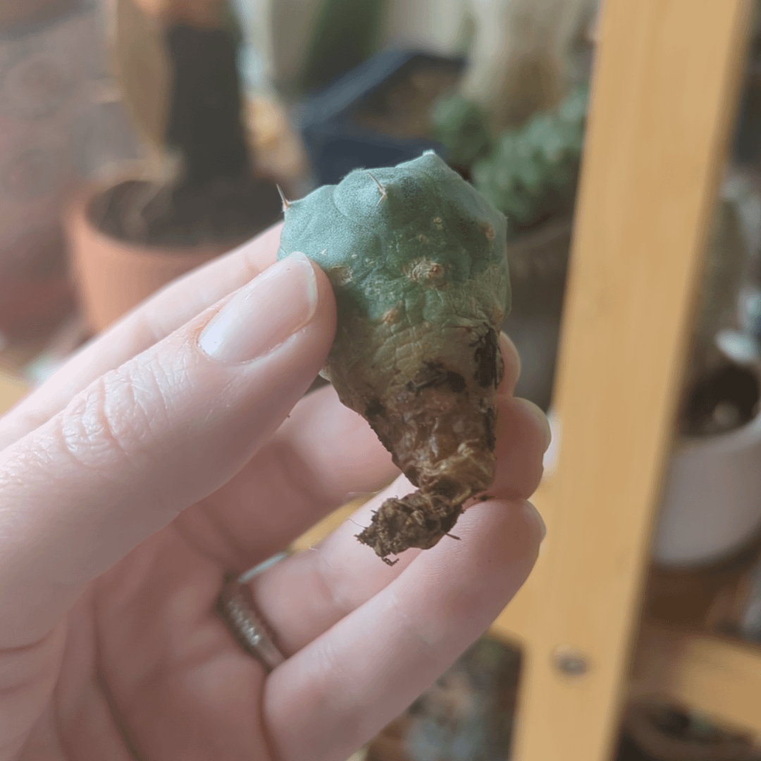 I purchased this turbinicarpus jauernigii a couple of weeks ago. the seller sent it bare root, with a heat pack and insulation on the box. When I opened it it looked great, but I left the roots wrapped in tissue paper and didn't disturb the base, I kept it on my bench for 7 days then went to pot it up and found it looking like this. In my mind, a cactus like this should be able to be ok for months without soil, granted it would probably need to create new roots at that time.