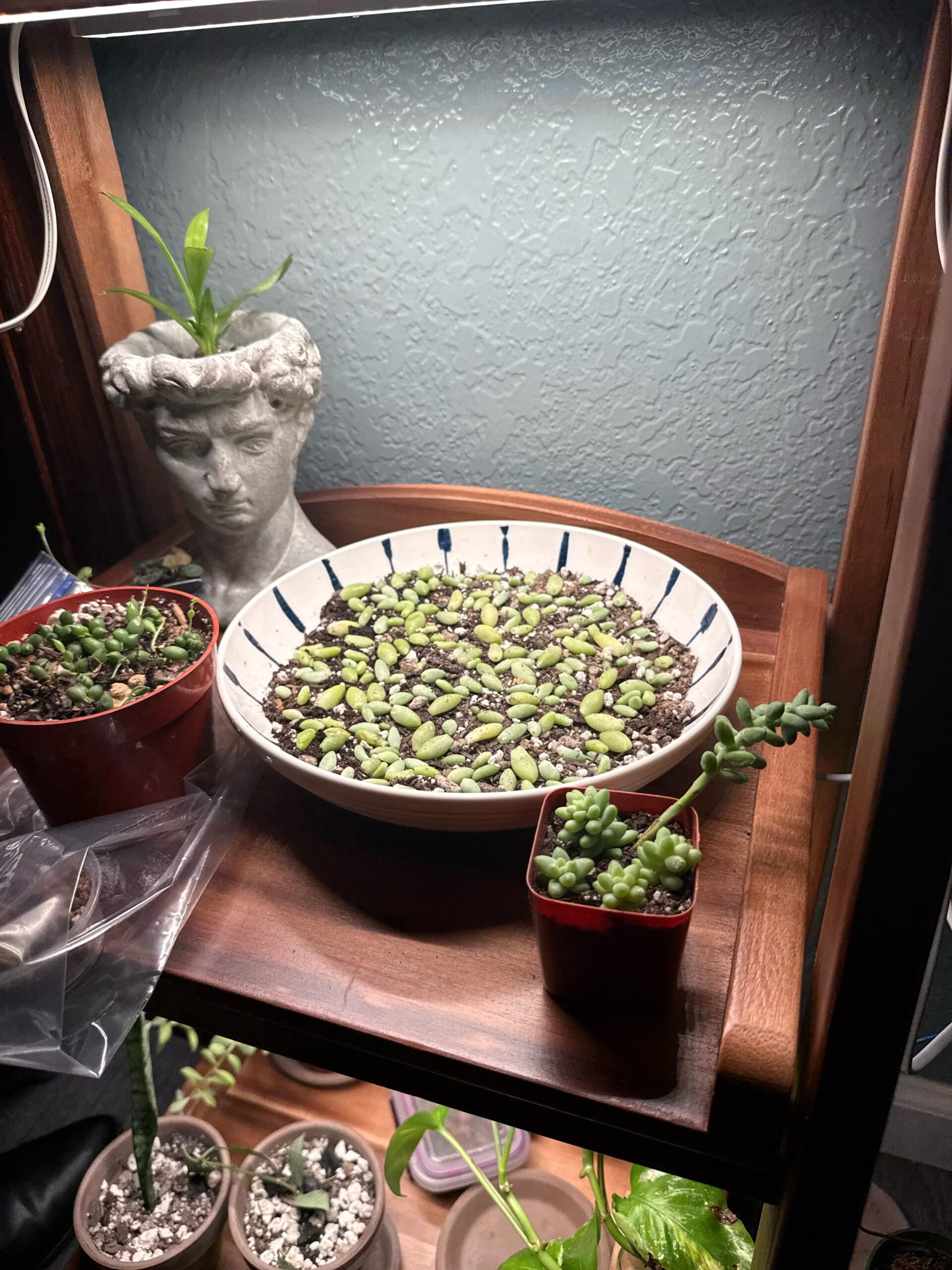 I’ve yet to get propagation from dropped burrow tail leaves, still trying after two months of them doing nothing, same with rubies (*Othonna capensis), you’ve got a good amount to attempt, good luck! Ones I’m attempting are covered with to keep up humidity and growing in half succulent mix and half perlite.*