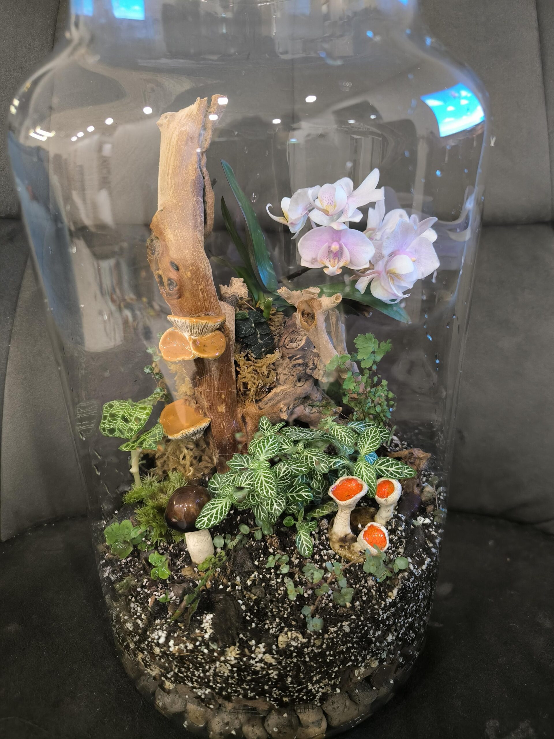 I built this for my niece for her birthday. I made ceramic mushrooms myself in a ceramics class. Plants that I ordered for this terrarium didn't arrive in time. So I had to improvise with cuttings and divisions from the plants I own. I hope they take.