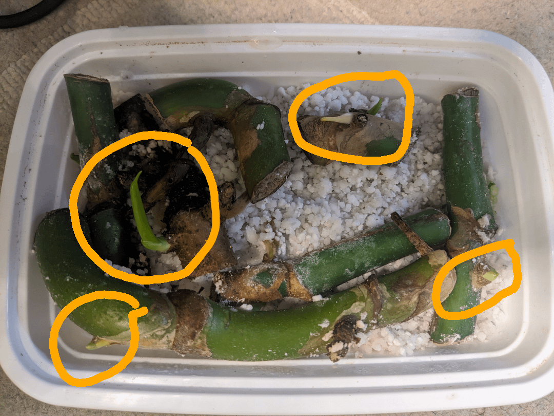 I am excited!! Started this in October when I rescued my neighbour's monstera plant that was long neglected and heavily infested. I chopped almost everything but saved a couple stems with nodes, did all the clean up and threw them into a take out container with perlite and some water. Never watered it again since October, covered with a lid and left near my plant shelf with a little bit of grow light.