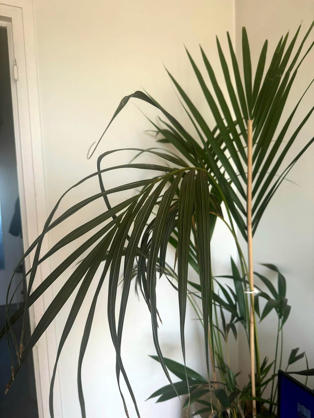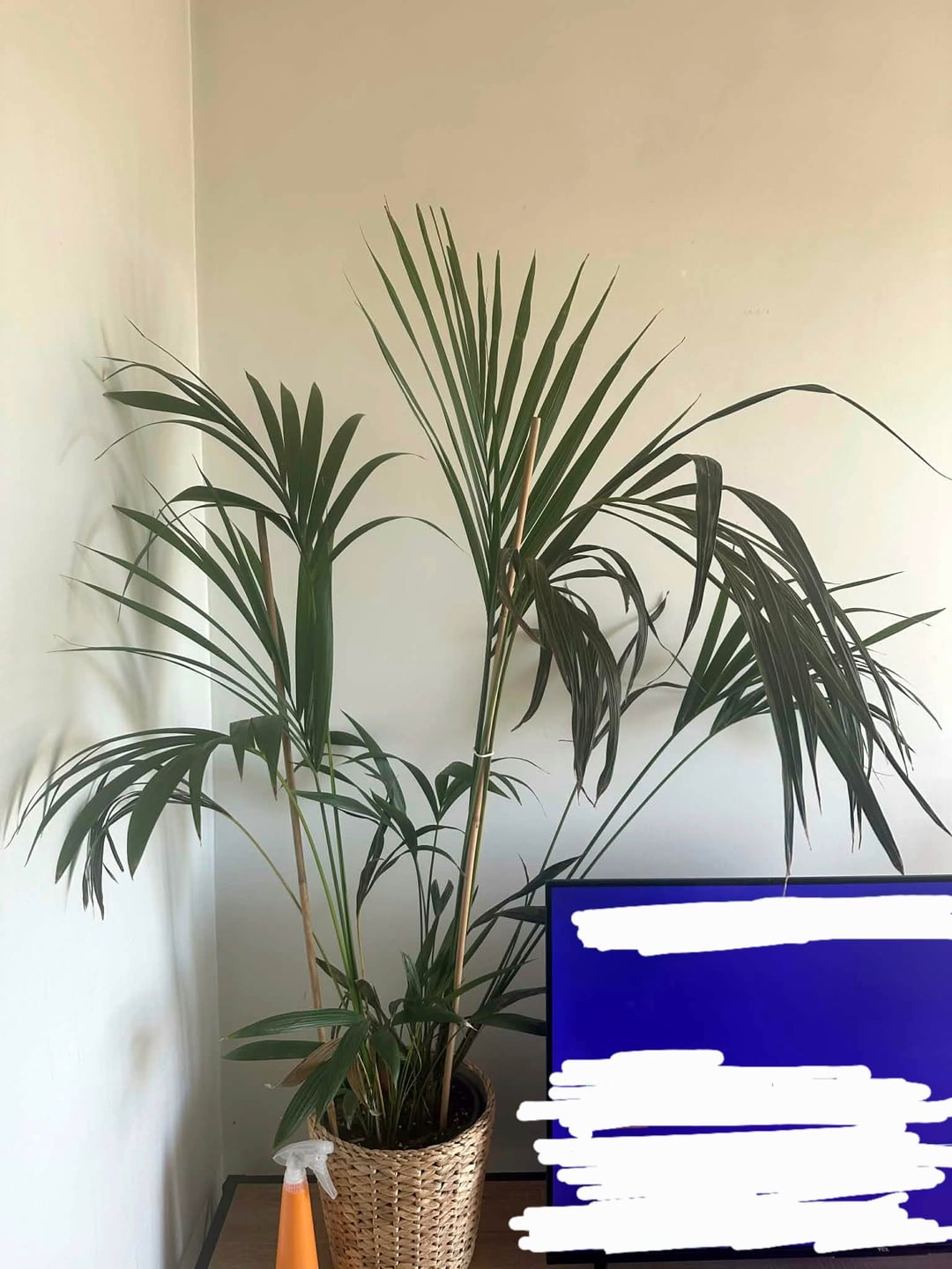 Hello plant parents of reddit. I'm new to plants and I've had this Kentia Palm for almost a year now. I used to water it weekly and / or whenever the soil felt really dry. Recently, I've been on an extended work trip. So during these two previous months, my husband has been taking care of it instead. He waters weekly, and sprays the leaves. However, he just sent me these pictures saying that the whole leaves of this particular branch (not just the tips) and the overall plant are getting drier and darker – see first pic. What can we do?! The soil is not overwatered and I don't think it's a rot problem. Should I repot? Water more? Add some kind of product? Also how to help it thrive in general? It always seemed frail and not so "leafy"..