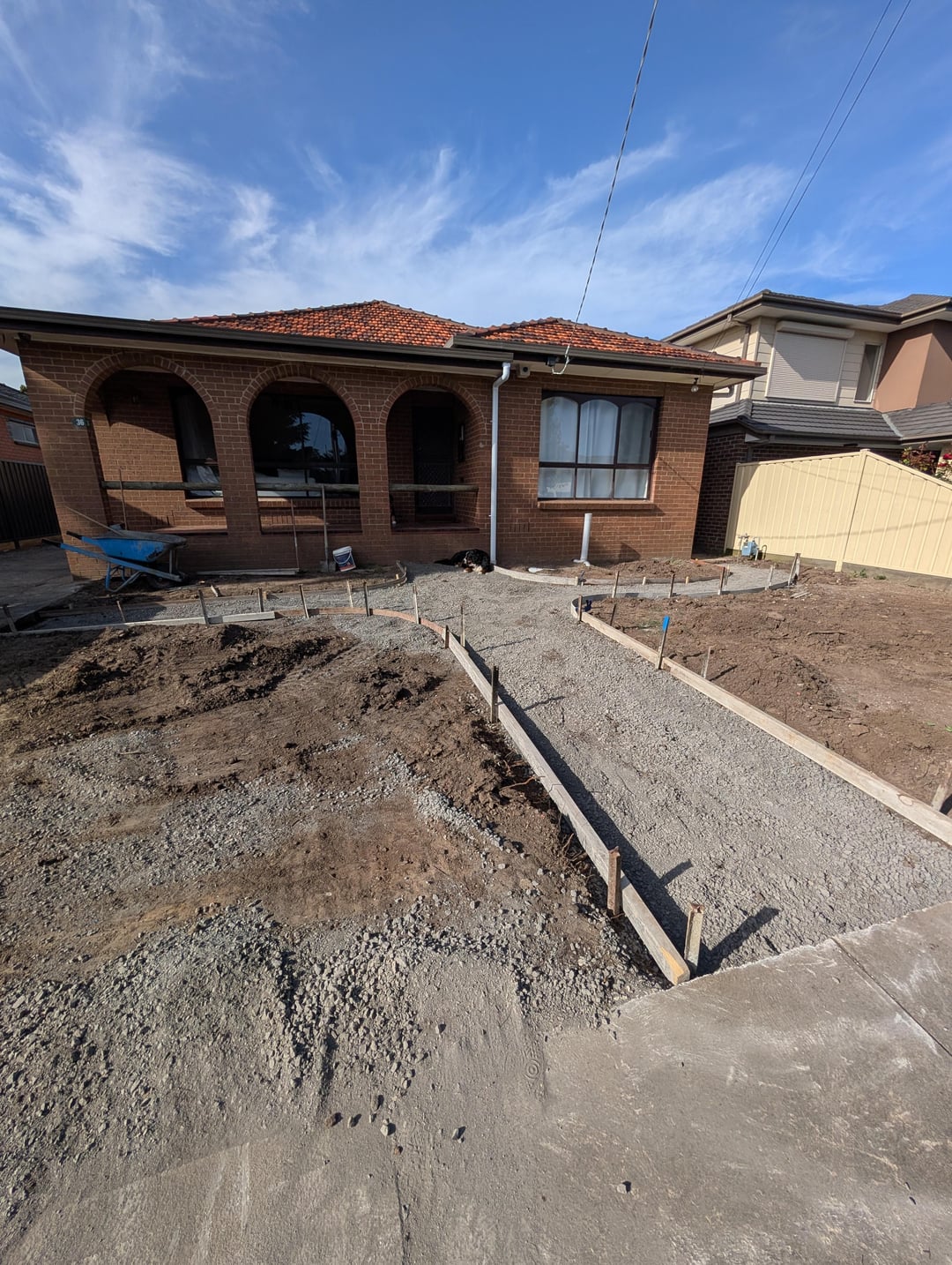 Not built yet: steps to the front door and the front fence/pedestrian gate.