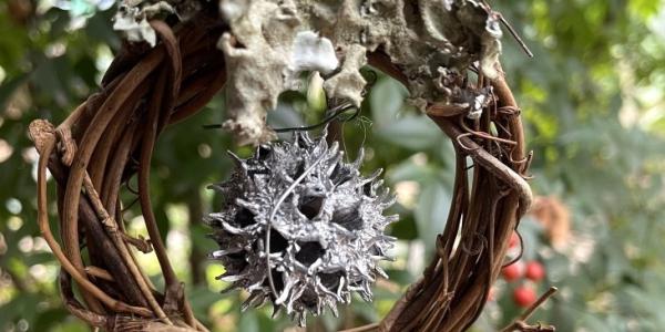 Inspired by these fond memories, I recently set about making some nature-craft ornaments along these lines, which involved a lot of suspicious-looking walking around the neighborhood looking for fodder, and risking my mental health trekking to a hobby store for supplies.