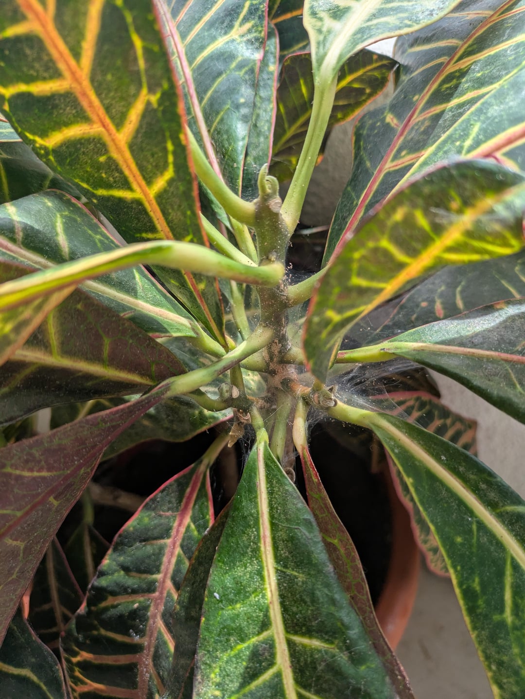 I'm not sure if you all can see but there's a fine web between the branches..the leaves are also looking dull and like they have a coating of dust. The plant had mild mealy bugs infestation earlier and I cleaned it out using Neem oil. I water the plant like normal – deep watering once a week. The plant is indoors but gets direct sunlight for 5-6 hours. Now I've put it out in the balcony.