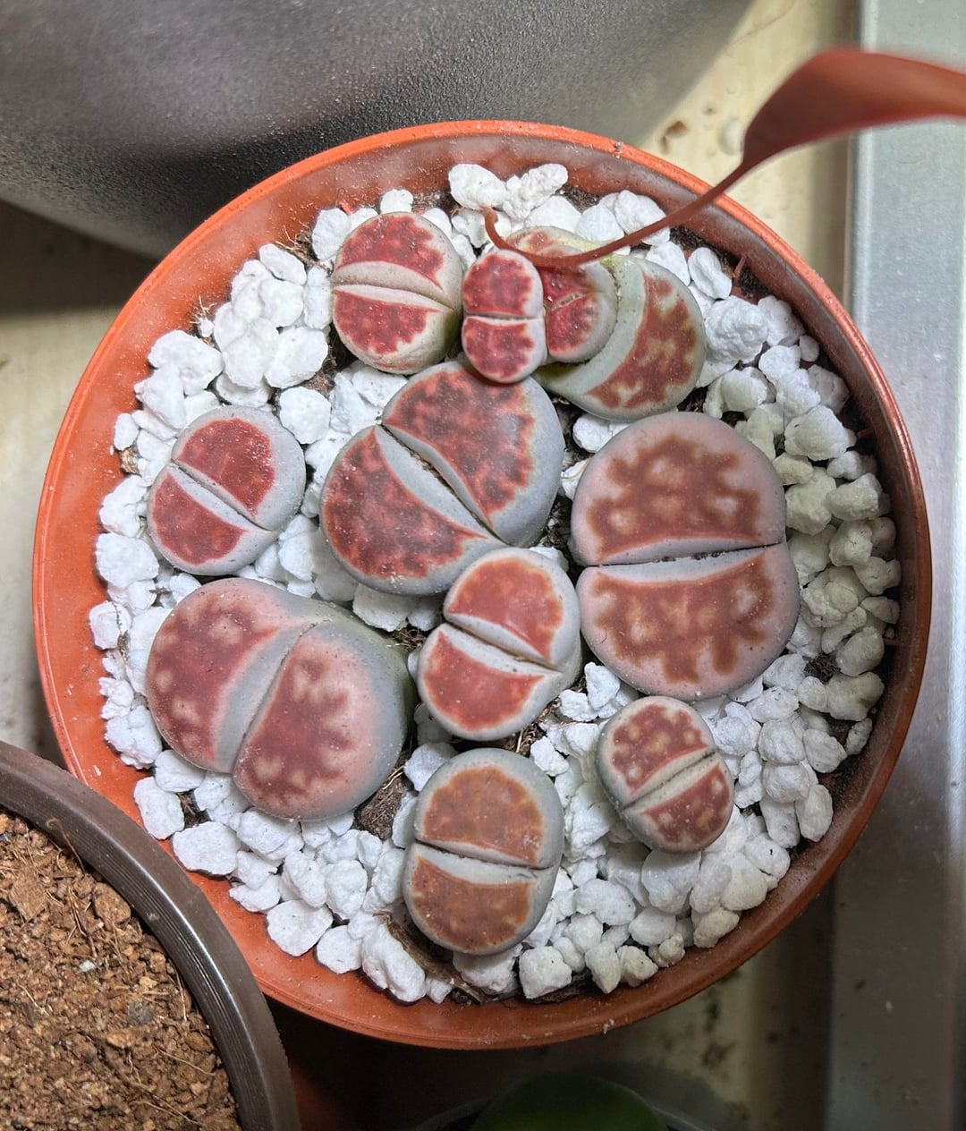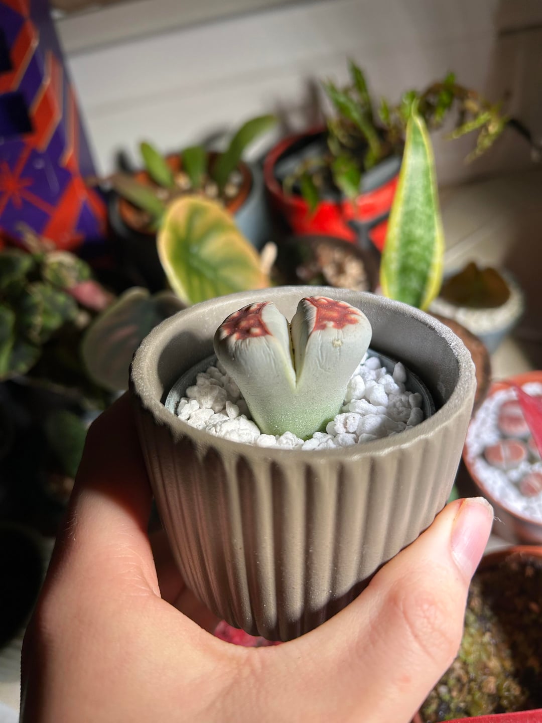 Yours seem so big compared to what I have atm. I ordered a two inch pot full of baby lithops I’ve finally got them separated into 15 different pots now and even then when they get bigger they have to be repotted again!,🤦 like there’s just so so many baby lithops ! Hopefully I can keep the rest of them alive! My cats knocked one pot off earlier. I rescued 5 lithops I could see Im not sure how many was actually in the pot tho. Hopefully just the 5 but they are so very tiny I mean like less than half a dime size. Idk very very tiny. That first week I realized they are growing and killing one another in this 2 inch pot that I better separate them. Now I’m just waiting to water them.. I’m not really sure when I should do that. These are very new to me and I’m trying here. I did get some grow lights tonight so I’ma have that started tomorrow for them and the couple leggy echeverias I got so hopefully it’s strong enough and fixes those problems and then I can cut them and propagate to get them to look right again. Poor things. Lol. Lol just nice work with your lithops. I really like the coloring on them. Mine seem to be some green and some shades of purple. Not sure exact kinds besides lithops lol