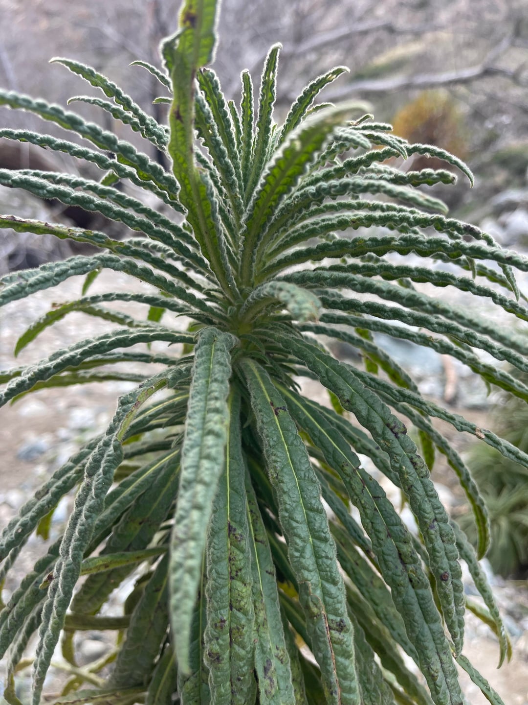 Also sometimes called Eriodictyon parryi, with the common name poodle-dog bush. It’s in the family Boraginaceae, and can apparently cause skin irritation if touched. Cool plant though! I hope to see it in person someday (I live in NorCal outside of its native range).