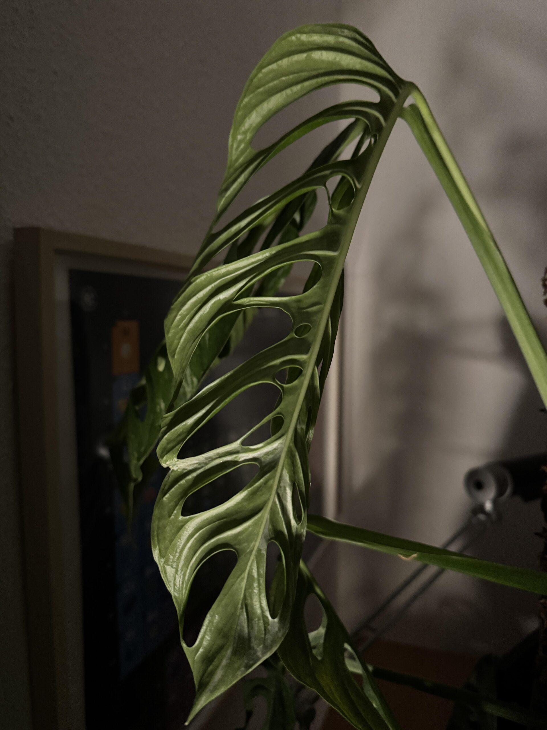 The plant grows up a moss pole and seems quite healthy, but it was constantly troubled by awkwardly deformed leaves. Maybe it had something to do with it maturing? This latest leaf let‘s me hope that it finally left this stage behind. Let‘s see!