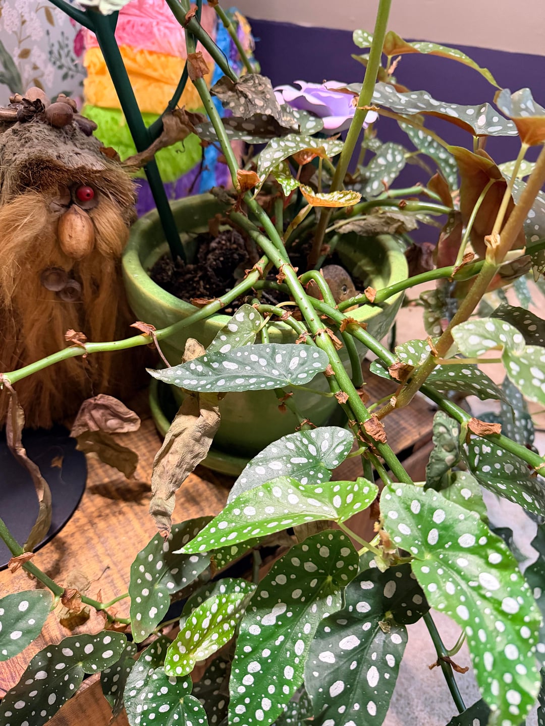 I have a polka dot begonia that has shot straight into the air recently and I’m not sure if I should wait to repot it. The research I’ve found is that it’s best to repot in the spring, which absolutely makes sense, but will I kill it if I wait that long? I’m also afraid of it tipping over so I got some stakes for it. I would appreciate any advice you have to give! Thank you! (She lives under a grow light and a window.)