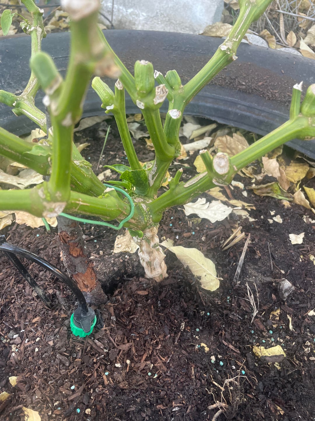 Stem is turning a brown ish color. Recently trimmed to improve growth which prior to this we had a some bell peppers. It’s starting to get cold as well, but the leafs showing up are new and overall seems healthy just concerned for the stem. Plant is watered well, soil is moist and is given fertilizer. Don’t know if this is normal first time growing fertilizer.