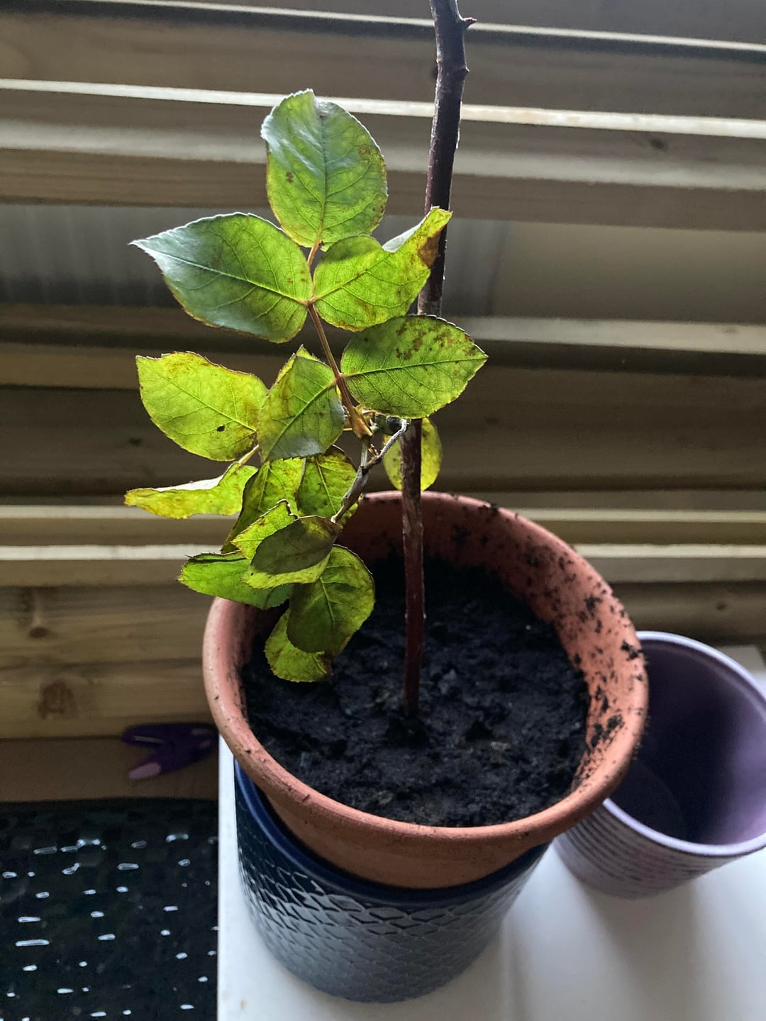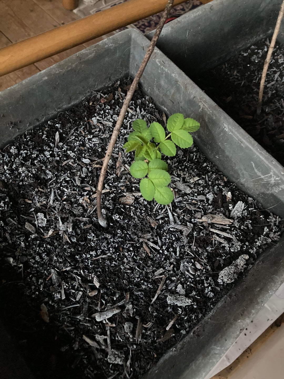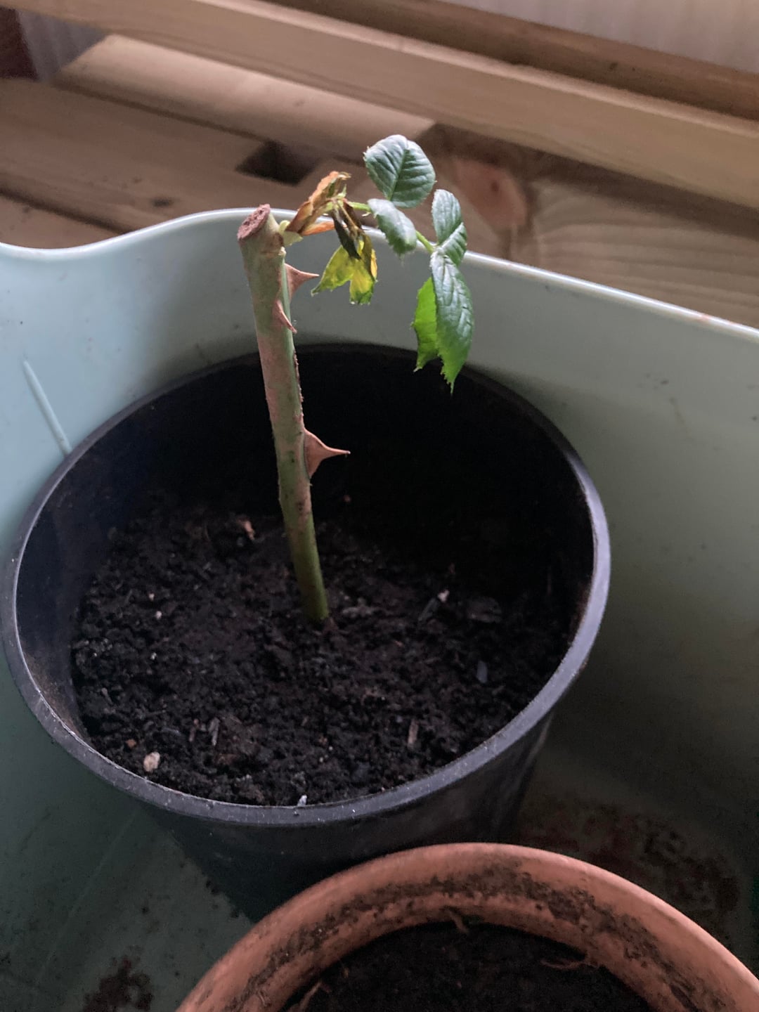 One of the yellow rose branches was damaged, so I put some cuttings in tomato growbag soil, which was all I had at that point. Some started out growing well but then got mouldy at the base of the stem and died (Photo 2). Another of the unidentified ones became mouldy but has put up new shoots from the soil (Photo 3). I haven’t watered them much so wonder if the growbag soil is too damp or doesn’t have the right nutrients for them. Should I repot the remaining cuttings in something else? Should I cut the mouldy stem off the one in photo 3 or leave it alone to sort itself out? What else can I do to keep the remaining cuttings alive?