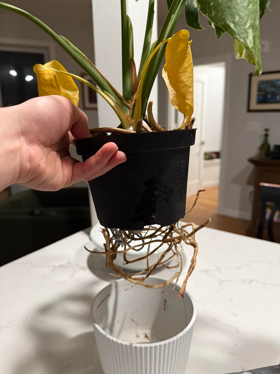 Is this monsters getting too big for its pot? The black plastic pot hangs over a space where the roots have grown down. Is this bad? How do you know it’s time to give it more space for roots? by Dio-is-cool monstera 2 Comments Ok_Ant_9815 1 day ago It’s time. Zestyclose-Solid2861 1 day ago Get a clear/dee through pot next time but yes id say its time from how many roots are coming out the bottom and especially the top of the pot