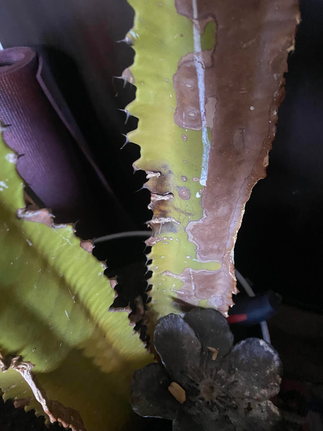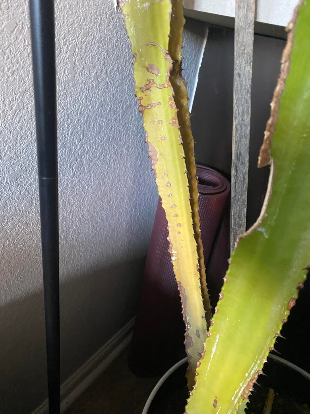 My wife’s euphorbia, was transplanted within the last 3 years. Yellowing begins at base and spreads until finally the branch collapses or dries. Thinking it is fungal, haven’t watered for ~2 months in Colorado. Last pic I cut a week ago to try to contain the spread. Worried it will die entirely, so considering taking cuttings to propagate and regrow. Any advice is greatly appreciated.