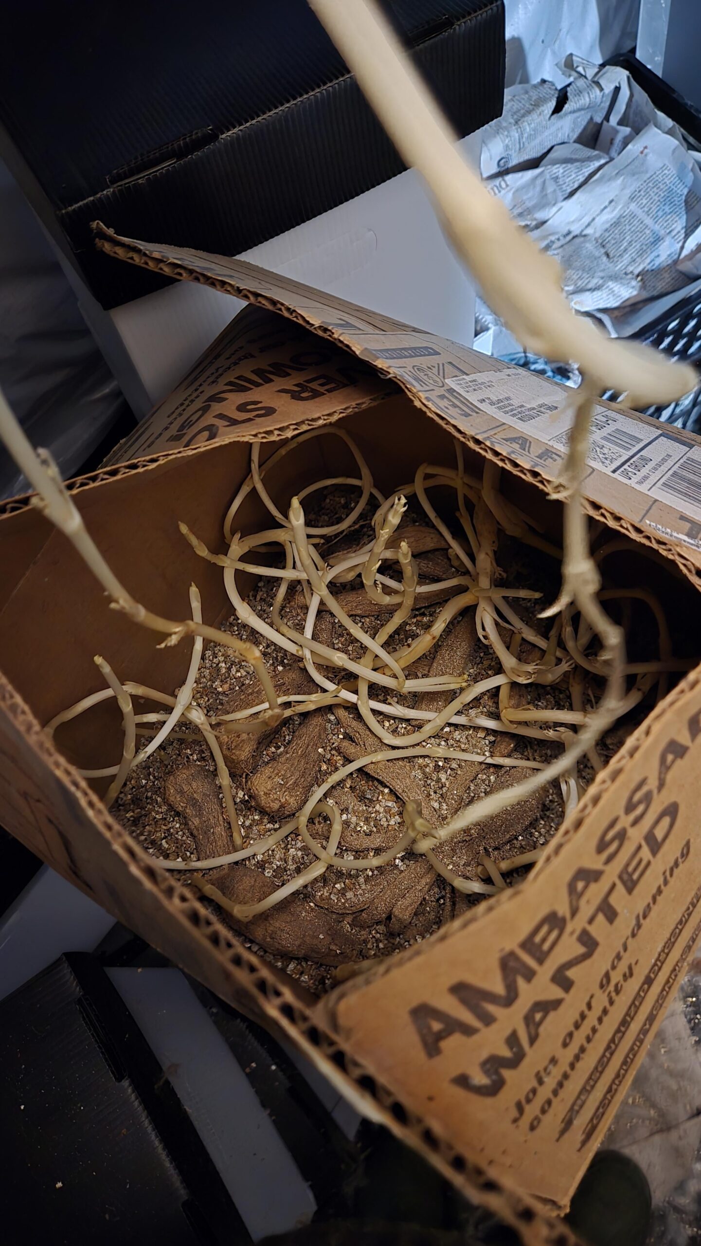 I was in my crawlspace moving some things around today and noticed something climbing out of a box- a box of tubers I stored last winter and forgot to pull out in the spring. They had all produced these really long stems just reaching out for the light that wasn't there. Just incredible to see the tenacity!