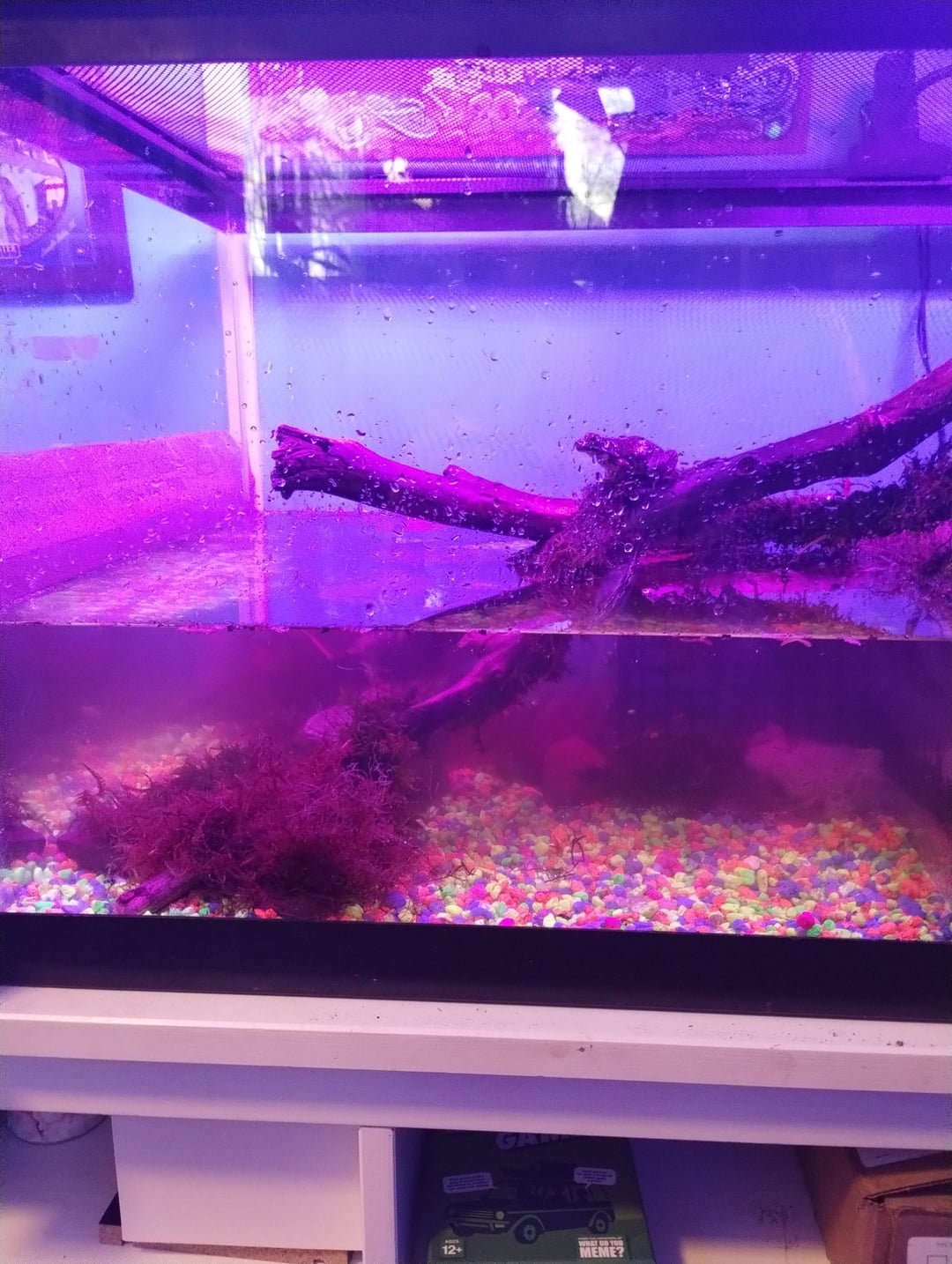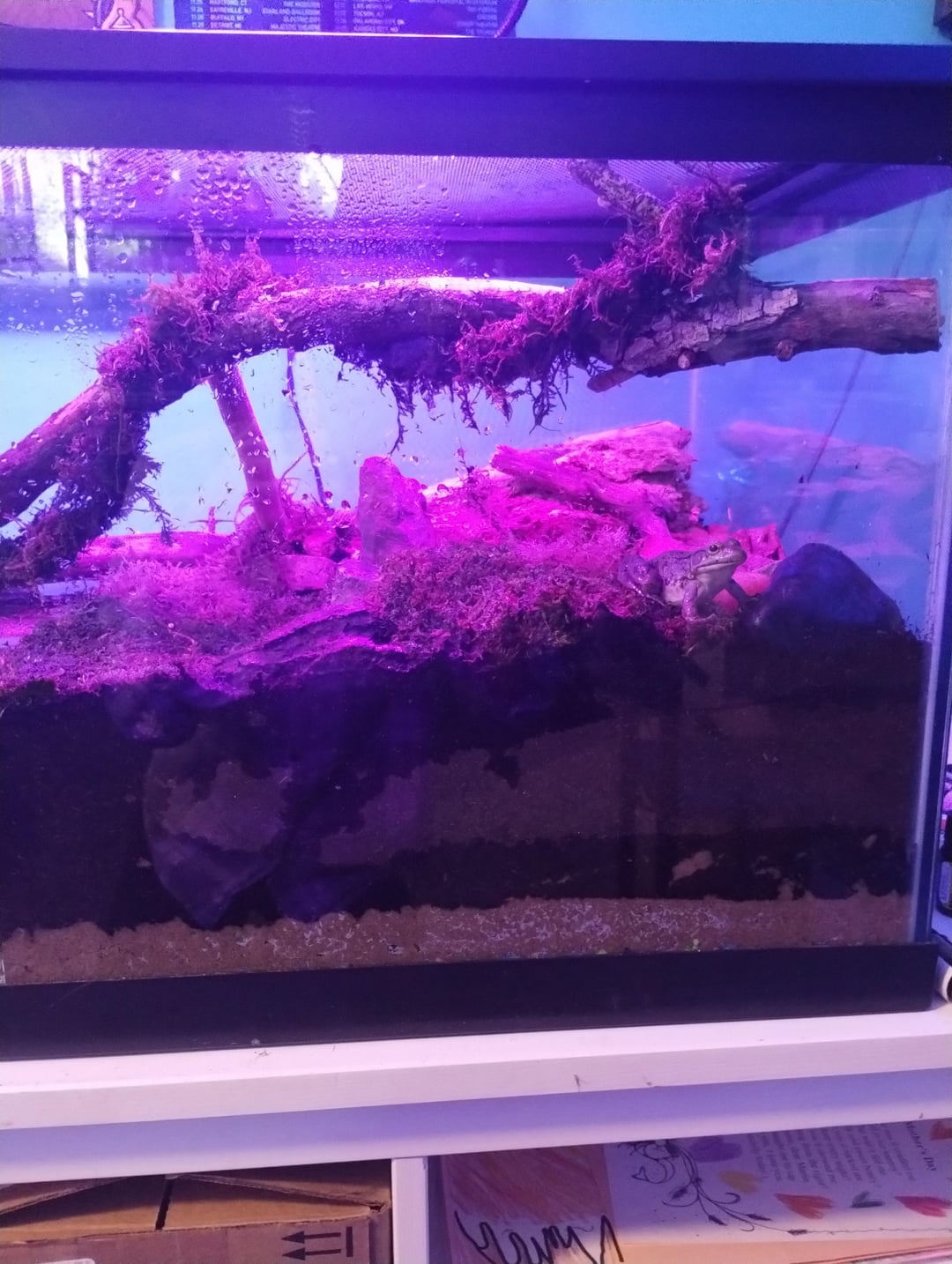 Helped my mom make this paladarium for our frogs since the last one they were in was too small. They have an egg crate in the back corner to help them get out of the water. Lots of bugs with hiding/breeding spaces, a small den, and she just got some feeder minnows to put in the water for them as well. Hopefully everything integrates well and it becomes almost self-sufficient.